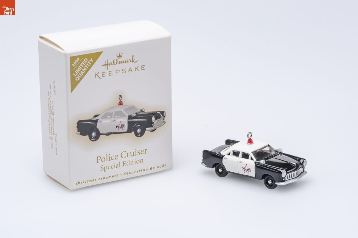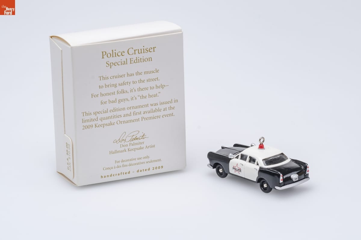 Police Cruiser / Special Edition / This cruiser has the muscle to bring safety to the street. / For honest folks, it's there to help-- / for bad guys, it's "the heat." / This special edition ornament was issued in / limited quantities and first available at the / 2009 Keepsake Ornament Premiere event. / Don Palmiter / Hallmark Keepsake Artist / For decorative use only. / Concu a des fins decoratives seulement. / handcrafted - dated 2009