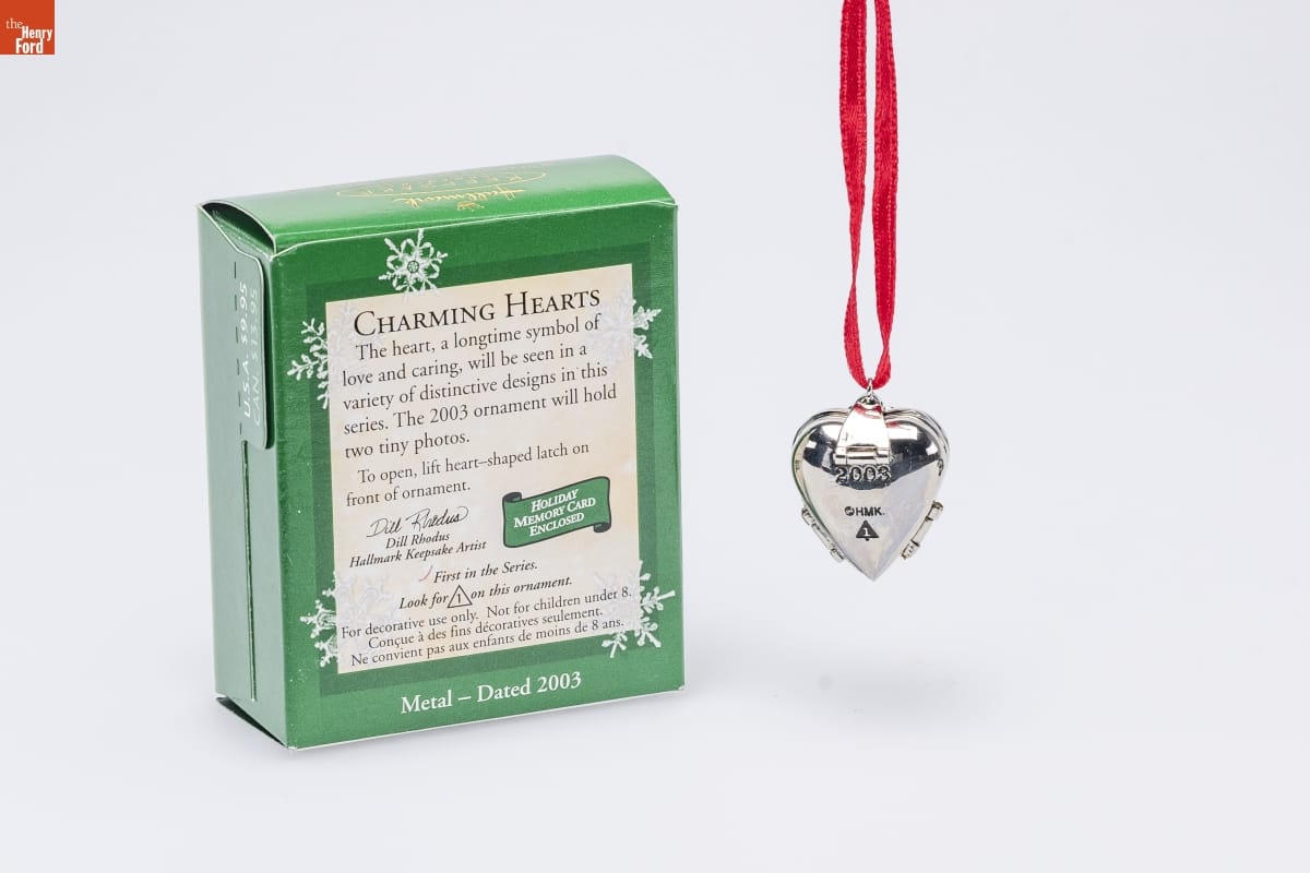 CHARMING HEARTS / The heart, a longtime symbol of / love and caring, will be seen in a / variety of distinctive designs in this / series. The 2003 ornament will hold / two tiny photos. / To open, lift heart-shaped latch on / front of ornament. / HOLIDAY / MEMORY CARD / ENCLOSED / Dill Rhodus / Hallmark Keepsake Artist / First in the Series. / Look for 1 on this ornament. / For decorative use only. Not for children under 8. / Concue a des fins decoratives seulement. / Ne convient pas aux enfants de moins de 8 ans. / Metal - Dated 2003