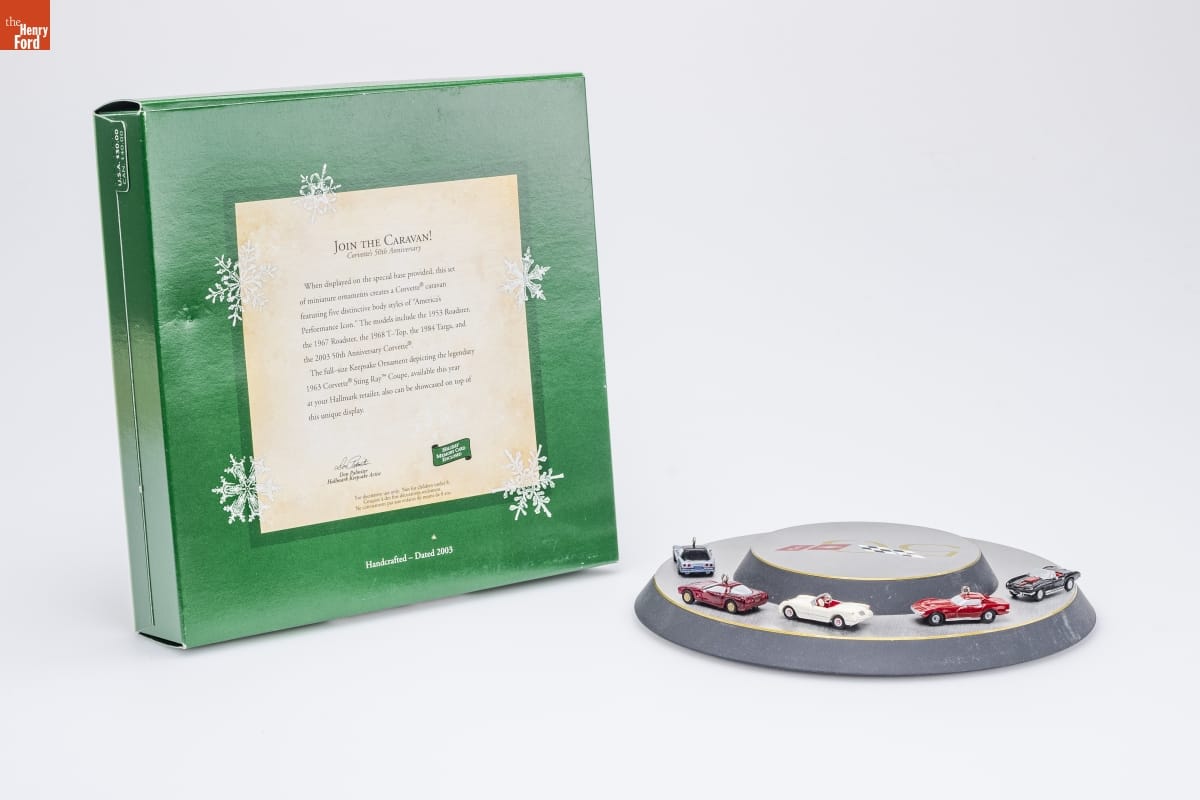 JOIN THE CARAVAN! / Corvette's 50th Anniversary / When displayed on the special base provided, this set / of miniature ornaments creates a Corvette(R) caravan / featuring five distinctive body styles of "America's / Performance Icon." The models include the 1953 Roadster, / the 1967 Roadster, the 1968 T-Top, the 1984 Targa, and / the 2003 50th Anniversary Corvette(R). / The full-size Keepsake Ornament depicting the legendary / 1963 Corvette(R) Sting Ray TM Coupe, available this year / at your Hallmark retailer, also can be showcased on top of / this unique display. / HOLIDAY / MEMORY CARD / ENCLOSED / Don Palmiter / Hallmark Keepsake Artist / For decorative use only. Not for children under 8. / Concues a des fins decoratives seulement. / Ne conviennent pas aux enfants de moins de 8 ans. / Handcrafted - Dated 2003