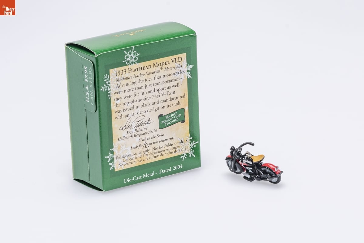1933 FLATHEAD MODEL VLD / Miniature Harley-Davidson(R) Motorcycles / Advancing the idea that motorcycles / were more than just transportation-- / they were for fun and sport as well-- / this top-of-the-line 74ci V-Twin / was issued in black and mandarin red / with an art deco design on its tank. / HOLIDAY / MEMORY CARD / ENCLOSED / Don Palmiter / Hallmark Keepsake Artist / Sixth in the Series. / Look for 6 on this ornament. / For decorative use only. Not for children under 8. / Concue a des fins decoratives seulement. / Ne convient pas aux enfants de moins de 8 ans. / Die-Cast Metal - Dated 2004