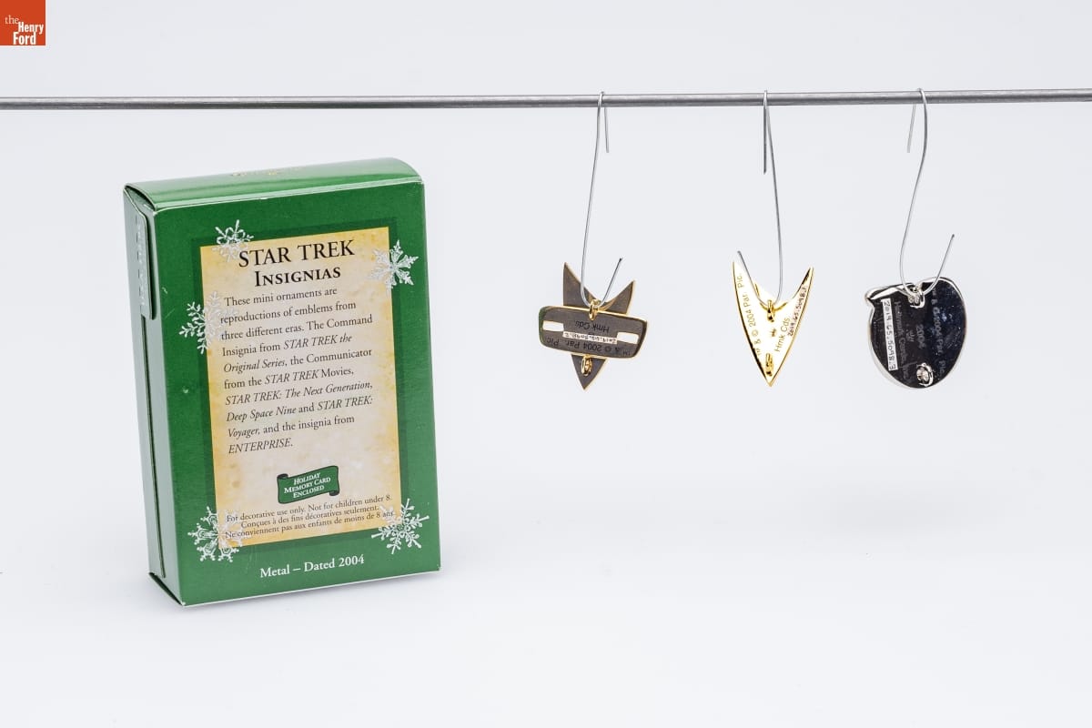 STAR TREK TM / INSIGNIAS / These mini ornaments are / reproductions of emblems from / three different eras. The Command / Insignia from STAR TREK the / Original Series, the Communicator / from the STAR TREK Movies, / STAR TREK: The Next Generation, / Deep-Space Nine and STAR TREK / Voyager, and the insignia from / ENTERPRISE. / HOLIDAY / MEMORY CARD / ENCLOSED / For decorative use only. Not for children under 8. / Concues a des fins decoratives seulement. / Ne conviennent pas aux enfants de moins de 8 ans. / Metal - Dated 2004