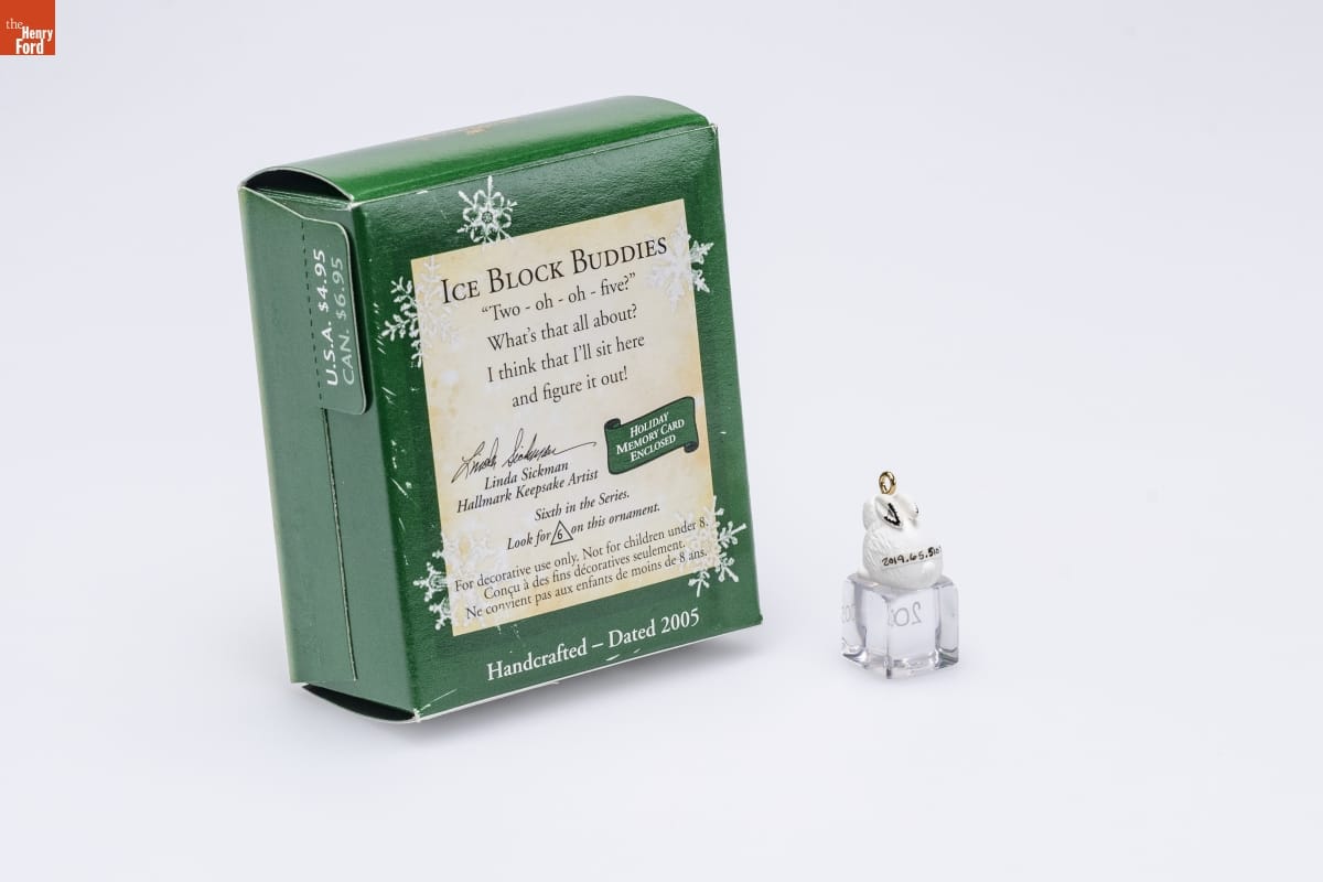 ICE BLOCK BUDDIES / "Two - oh - oh - five?" / What's that all about? / I think I'll sit here / and figure it out! / HOLIDAY / MEMORY CARD / ENCLOSED / Linda Sickman / Hallmark Keepsake Artist / Sixth in the Series. / Look for 6 on this ornament. / For decorative use only. Not for children under 8. / Concu a des fins decoratives seulement. / Ne convient pas aux enfants de moins de 8 ans. / Handcrafted - Dated 2005