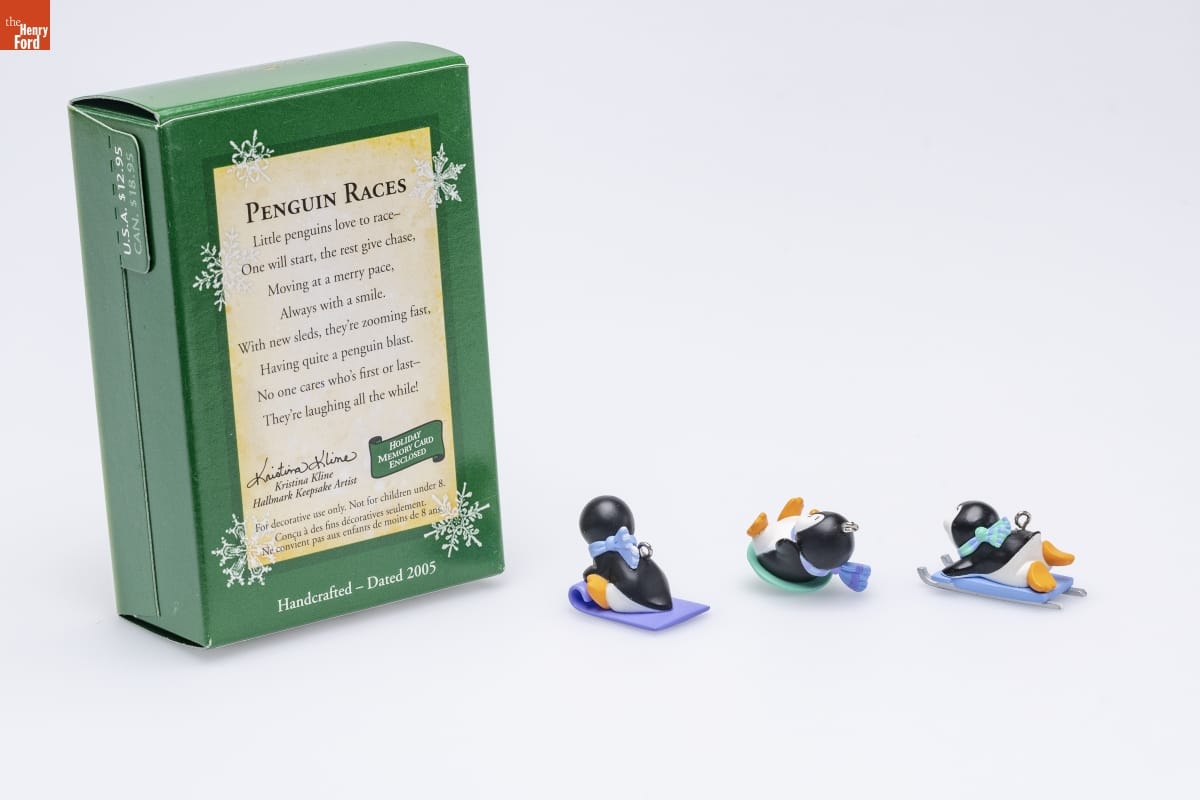PENGUIN RACES / Little penguins love to race- / One will start, the rest give chase, / Moving at a merry pace, / Always with the smile. / With new sleds, they're zooming fast, / Having quite a penguin blast, / No one cares who's first or last- / They're laughing all the while! / HOLIDAY / MEMORY CARD / ENCLOSED / Kristina Kline / Hallmark Keepsake Artist / For decorative use only. Not for children under 8. / Concu a des fins decoratives seulement. / Ne convient pas aux enfants de moins de 8 ans. / Handcrafted - Dated 2005