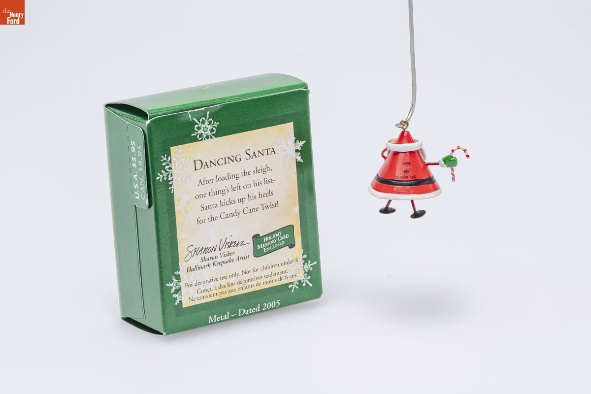 DANCING SANTA / After loading the sleigh, / one thing's left on his list- / Santa kicks up his heels / for the Candy Cane Twist! / HOLIDAY / MEMORY CARD / ENCLOSED / Sharon Visker / Hallmark Keepsake Artist / For decorative use only. Not for children under 8. / Concu a des fins decoratives seulement. / Ne convient pas aux enfants de moins de 8 ans. / Metal - Dated 2005