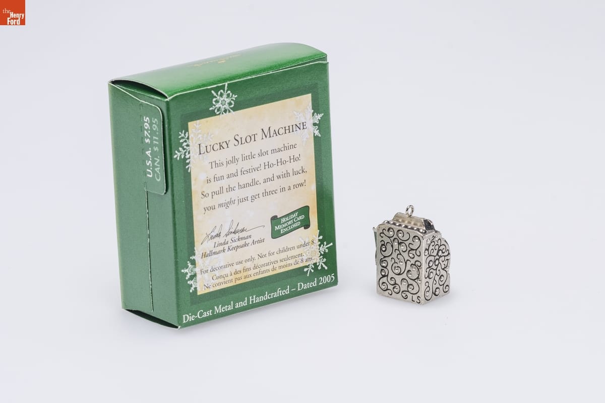 LUCKY SLOT MACHINE / This jolly little slot machine / is fun and festive! Ho-Ho-Ho! / So pull the handle, and with luck, / you might just get three in a row! / HOLIDAY / MEMORY CARD / ENCLOSED / Linda Sickman / Hallmark Keepsake Artist / For decorative use only. Not for children under 8. / Concu a des fins decoratives seulement. / Ne convient pas aux enfants de moins de 8 ans. / Die-Cast Metal and Handcrafted - Dated 2005