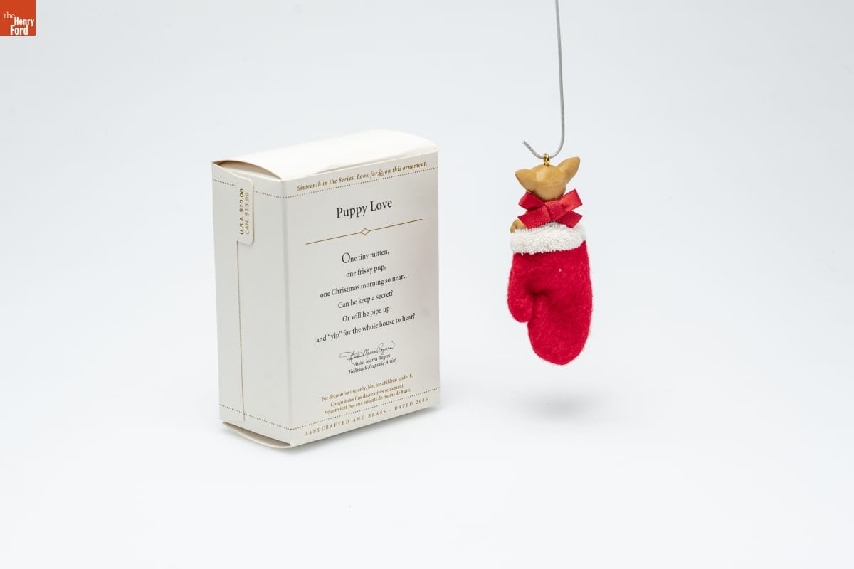 Sixteenth in the Series. Look for 16 on this ornament. / Puppy Love / One tiny mitten, / one frisky pup, / one Christmas morning so near... / Can he keep a secret? / Or will he pipe up / and "yip" for the whole house to hear? / Anita Marra Rogers / Hallmark Keepsake Artist / For decorative use only. Not for children under 8. / Concu a des fins decoratives seulement. / Ne convient pas aux enfants de moins de 8 ans. / HANDCRAFTED AND BRASS - DATED 2006