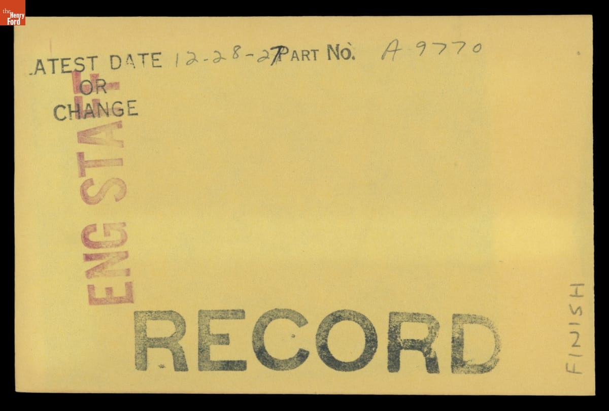 The Ford Motor Company created over a million parts drawings from 1903 to 1957. Many of these drawings specify engineering requirements for the components of Ford-made vehicles--including automobiles, trucks, tractors, military vehicles and Tri-motor airplanes. Others document assembly components, stages of casting and forging, or experimental designs. Beginning in the 1940s, Ford transferred the drawings to microfilm.