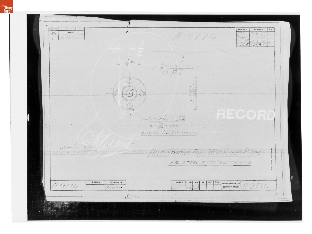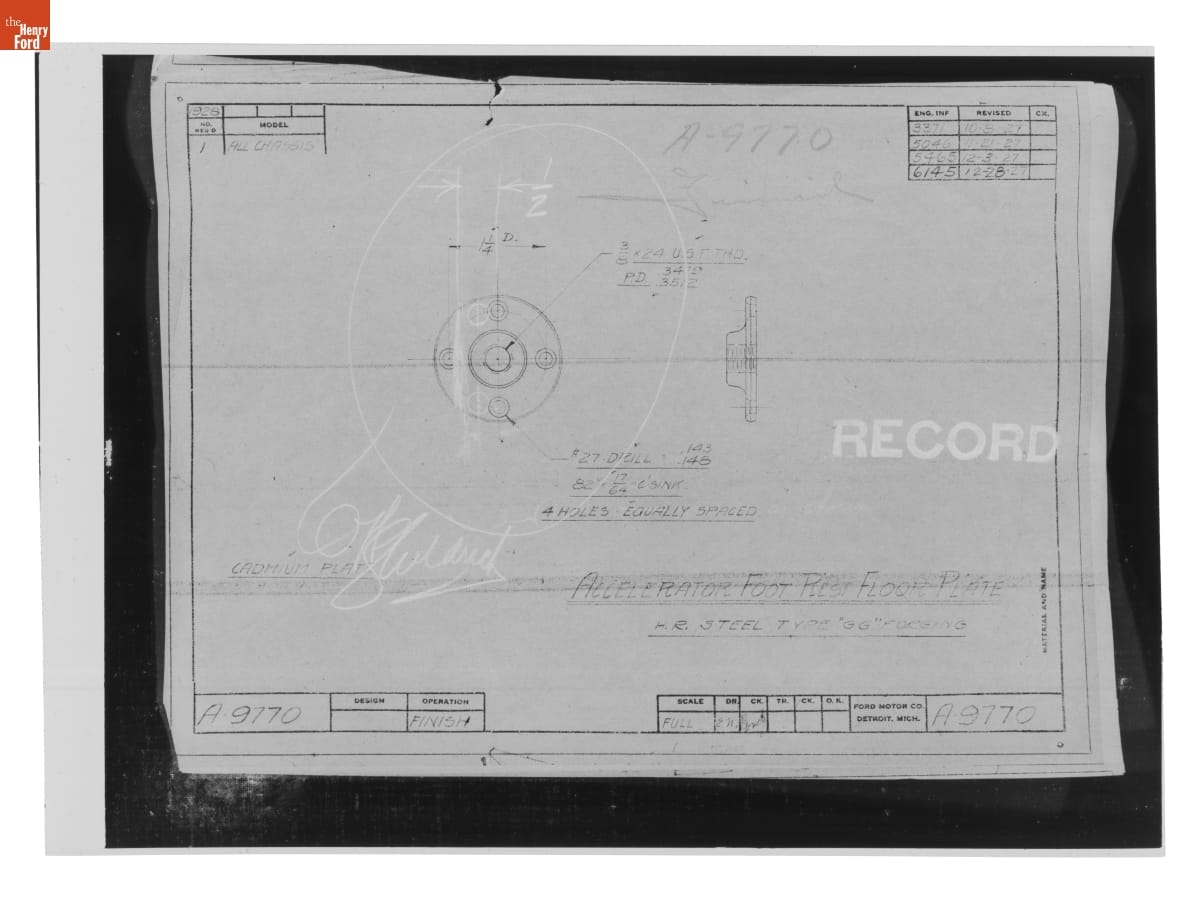 Drawing, "Accelerator Foot Rest Floor Plate," Finish, Ford Model A, December 28, 1927