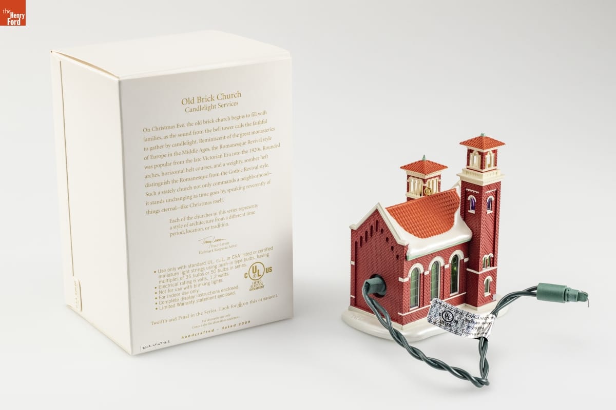 Old Brick Church / Candlelight Services / On Christmas Eve, the old brick church begins to fill with / families, as the sound from the bell tower calls the faithful / to gather by candlelight. Reminiscent of the great monasteries / of Europe in the Middle Ages, the Romanesque Revival style / was popular from the late Victorian Era into the 1920s. Rounded / arches, horizontal belt courses, and a weighty, somber heft / distinguish the Romanesque from the Gothic Revival style. / Such a stately church not only commands a neighborhood-- / it stands unchanging as time goes by, speaking reverently of / things eternal--like Christmas itself. / Each of the churches in this series represents / a style of architecture from a different time / period, location, or tradition. / Tracy Larsen / Hallmark Keepsake Artist / Use only with standard UL, cUL, or CSA listed or certified / miniature of light strings using ush-in bulbs, having / multiples of 35 bulbs or 50 bulbs in series. / Electrical rating 6 volts, 1.2 watts. / Not for use with blinking lights. / For indoor use only. / Complete display instructions enclosed. / Limited Warranty statement enclosed. / C UL(R) US / LISTED / ELECTRIC / ORNAMENT / Twelfth and Final in the Series. Look for 12 on this ornament. / For decorative use only. / Concu a des fins decoratives seulement. / handcrafted - dated 2009