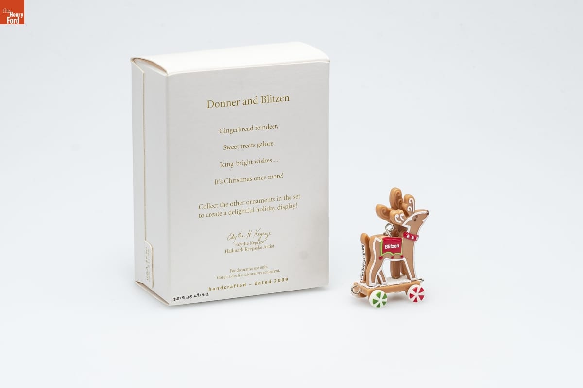 Donner and Blitzen / Gingerbread reindeer, / Sweet treats galore, / Icing-bright wishes... / It's Christmas once more! / Collect the other ornaments in the set / to create a delightful holiday display! / Edythe Kegrize / Hallmark Keepsake Artist / For decorative use only. / Concu a des fins decoratives seulement. / handcrafted - dated 2009