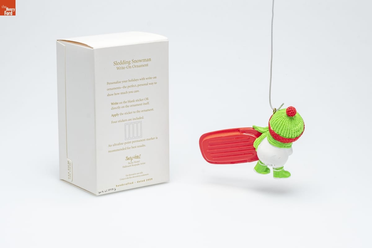 Sledding Snowman / Write-On Ornament / Personalize your holidays with write-on / ornaments--the perfect, personal way to / show how much you care. / Write on the blank sticker OR / directly on the ornament itself. / Apply the sticker to the ornament. / Four stickers are included. / An ultrafine-point permanent marker is / recommended for best results. / Becky Hottel / Hallmark Keepsake Artist / For decorative use only. / Concu a des fins decoratives seulement. / handcrafted - dated 2009