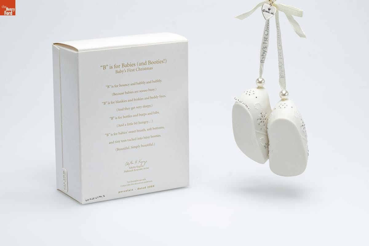 "B" is for Babies (and Booties!) / Baby's First Christmas / "B" is for bouncy and babbly and bubbly. / (Because babies are soooo busy.) / "B" is for blankies and binkies and beddy-byes. / (And they get very sleepy.) / "B" is for bottles and burps and bibs. / (And a little bit hungry... ) / "B" is for babies' sweet breath, soft bottoms, / and tiny toes tucked into bity booties. / (Beautiful. Simply beautiful.) / Edythe Kegrize / Hallmark Keepsake Artist / For decorative use only. / Concu a des fins decoratives seulement. / porcelain - dated 2009