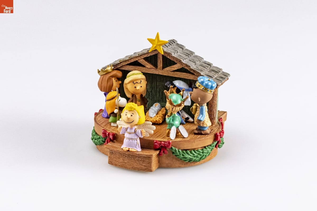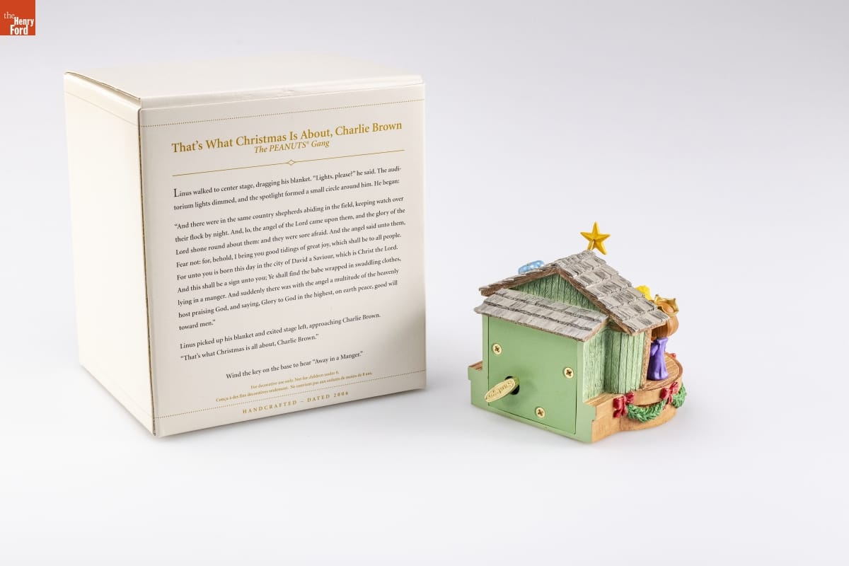 That's What Christmas Is About, Charlie Brown / The PEANUTS (R) Gang / Linus walked to center stage, dragging his blanket. "Lights, please?" he said. The audi- / itorium lights dimmed, and the spotlight formed a small circle around him. He began: / "And there were in the same country shepherds abiding in the field, keeping watch over / their flock by night. And, lo, the angel of the Lord came upon them, and the glory of the / Lord shone round about them: and they were sore afraid. And the angel said unto them, / Fear not: for, behold, I bring you good tidings of great joy, which shall be to all people. / For unto you is born this day in the city of David a Saviour, which is Christ the Lord. / And this shall be a sign unto you; Ye shall find the babe wrapped in swaddling clothes, / lying in a manger. And suddenly there was with the angel a multitude of the heavenly / host praising God, and saying, Glory to God in the highest, on earth peace, good will / toward men." / Linus picked up his blanket and exited stage left, approaching Charlie Brown. / "That's what Christmas is all about, Charlie Brown." / Wind the key on the base to hear "Away in the Manger." / For decorative use only. Not for children under 8. / Concu a des fins decoratives seulement. / Ne convient pas aux enfants de moins de 8 ans. / HANDCRAFTED - DATED 2006