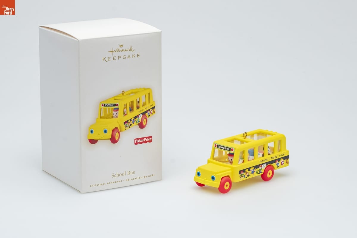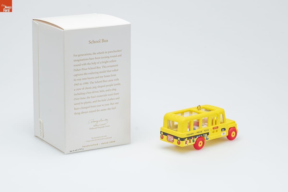 School Bus / For generations, the wheels in preschoolers' / imaginations have been turning round and / round with the help of a bright yellow / Fisher-Price School Bus. This ornament / captures the enduring model that rolled / its way into hearts and toy boxes from / 1965 to 1990. The School Bus came with / a crew of classic peg-shaped people inside, / including a bus driver, kids, and a dog. / Over time, the bus's materials went from / wood to plastic, and the kids' clothes and / faces changed from year to year. But one / thing always stayed the same - the fun! / Rodney Gentry / Hallmark Keepsake Artist / For decorative use only. / Concu a des fins decoratives seulement. / handcrafted - dated 2009