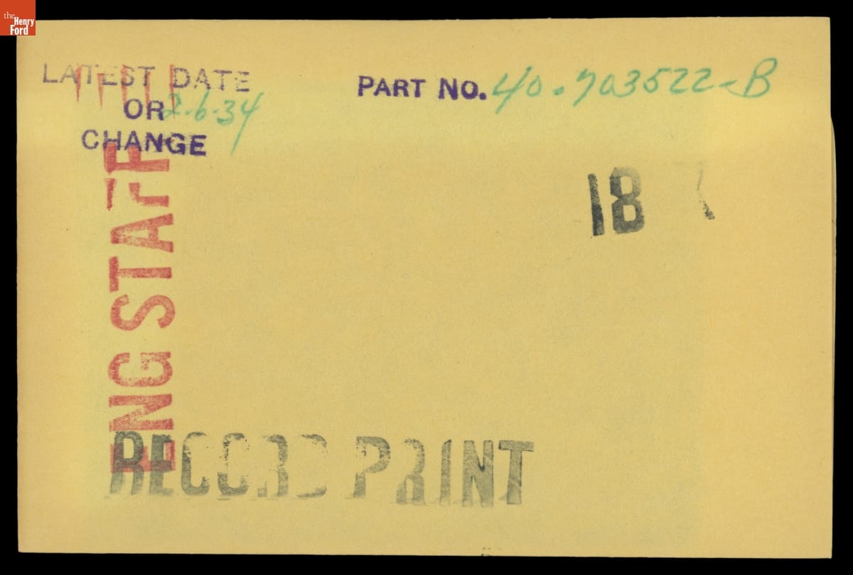 The Ford Motor Company created over a million parts drawings from 1903 to 1957. Many of these drawings specify engineering requirements for the components of Ford-made vehicles--including automobiles, trucks, tractors, military vehicles and Tri-motor airplanes. Others document assembly components, stages of casting and forging, or experimental designs. Beginning in the 1940s, Ford transferred the drawings to microfilm.