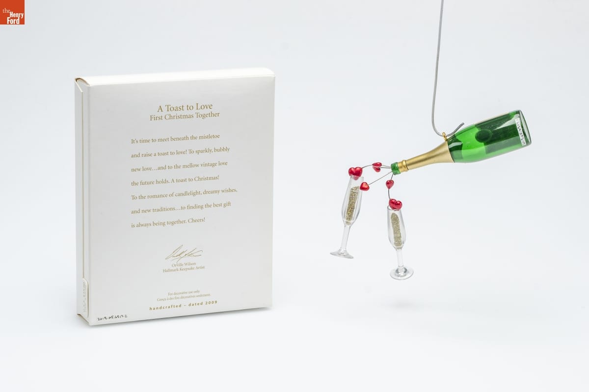 A Toast to Love / First Christmas Together / It's time to meet beneath the mistletoe / and raise a toast to love! To sparkly, bubbly / new love...and to the mellow vintage love / the future holds. A toast to Christmas! / To the romance of candlelight, dreamy wishes, / and new traditions...to finding the best gift / is always being together. Cheers! / Orville Wilson / Hallmark Keepsake Artist / For decorative use only. / Concu a des fins decoratives seulement. / handcrafted - dated 2009
