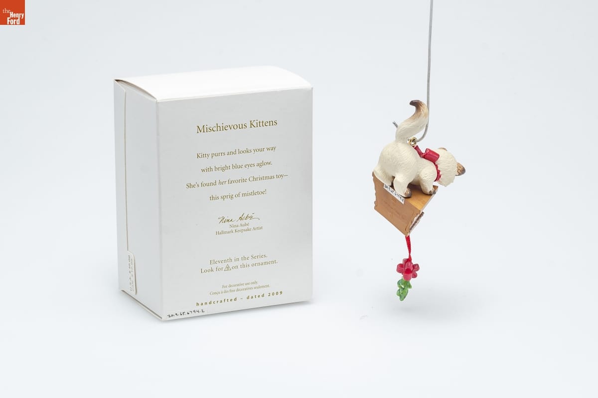 Mischievous Kittens / Kitty purrs and looks your way / with bright blue eyes aglow. / She's found her favorite Christmas toy-- / this sprig of mistletoe! / Nina Aube / Hallmark Keepsake Artist / Eleventh in the Series. / Look for 11 on this ornament. / For decorative use only. / Concu a des fins decoratives seulement. / handcrafted - dated 2009