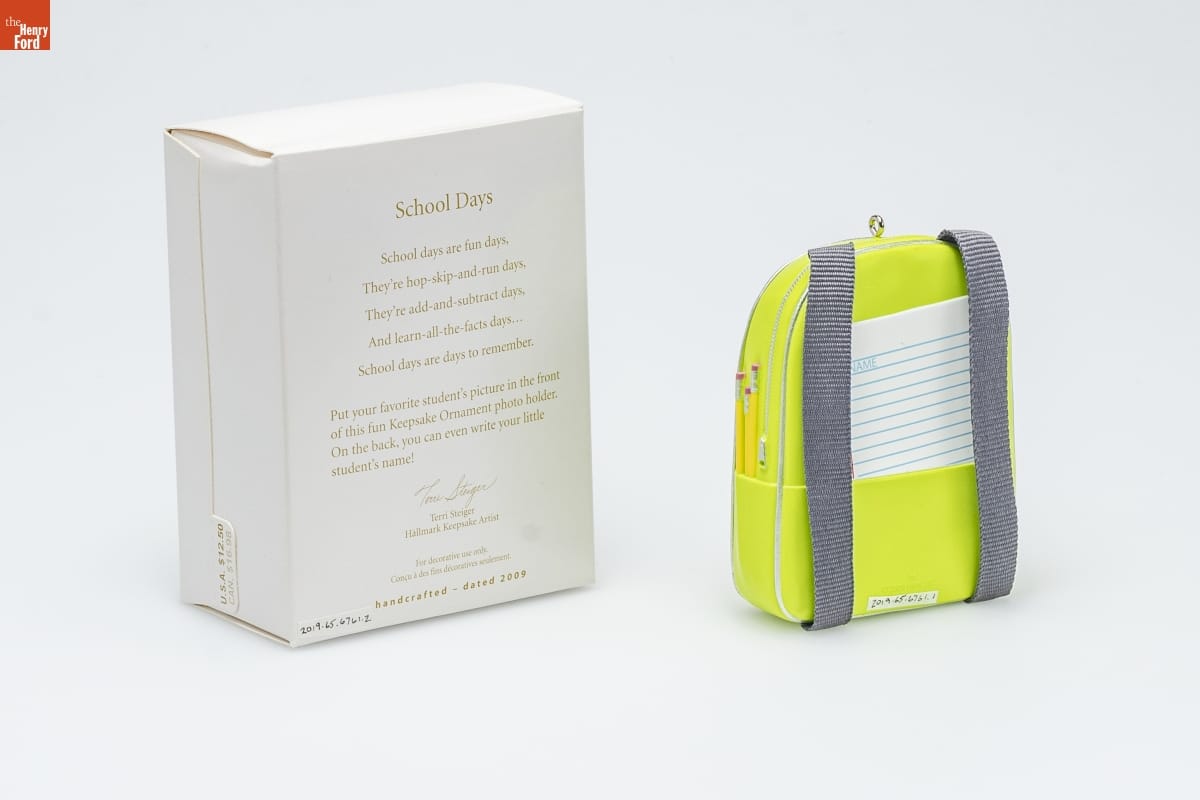 School Days / School days are fun days, / They're hop-skip-and-run days, / They're add-and-subtract days, / And learn-all-the-facts days... / School days are days to remember. / Put your favorite student's picture in the front / of this fun Keepsake Ornament photo holder. / On the back, you can even write your little / student's name! / Terri Steiger / Hallmark Keepsake Artist / For decorative use only. / Concu a des fins decoratives seulement. / handcrafted - dated 2009