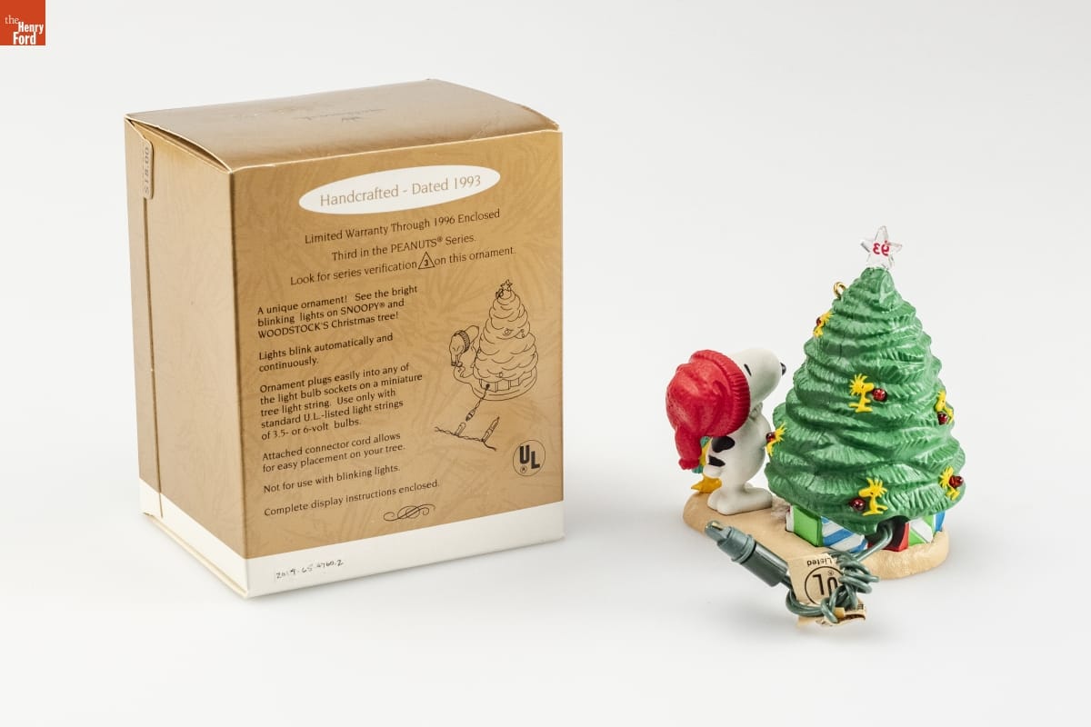 Handcrafted - Dated 1993 / Limited Warranty Through 1996 Enclosed / Third in the PEANUTS [R] Series. / Look for verification 3 on this ornament. / A unique ornament! See the bright / blinking lights on SNOOPY [R] and / WOODSTOCK'S Christmas tree! / Lights blink automatically and / continuously. / Ornament plugs easily into any of / the light bulb sockets on a miniature / tree light string. Use only with / standard U.L.- listed light strings / of 3.5- or 6- volt bulbs. / Attached connector cord allows / for easy placement on your tree. / Not for use with blinking lights. / Complete display instructions enclosed.
