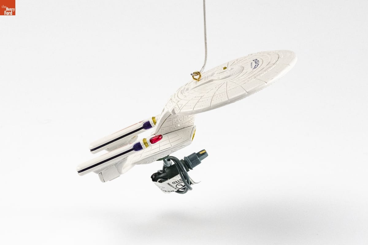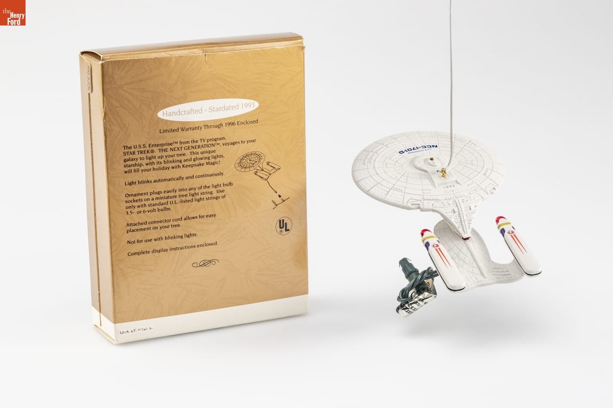 Handcrafted - Stardated 1993 / Limited Warranty Through 1996 Enclosed / The U.S.S. Enterprise [TM] from the TV program, / STAR TREK [R]: THE NEXT GENERATION [TM], voyages to your / galaxy to light up your tree. This unique / starship, with its blinking and glowing lights, / will fill your holiday with Keepsake Magic! / Light blinks automatically and continuously. / Ornament plugs easily into any of the light bulb / sockets on a miniature tree light string. Use / only with standard U.L.- listed light strings of / 3.5- or 6- volt bulbs. / Attached connector cord allows for easy / placement on your tree. / Not for use with blinking lights. / Complete display instructions enclosed.