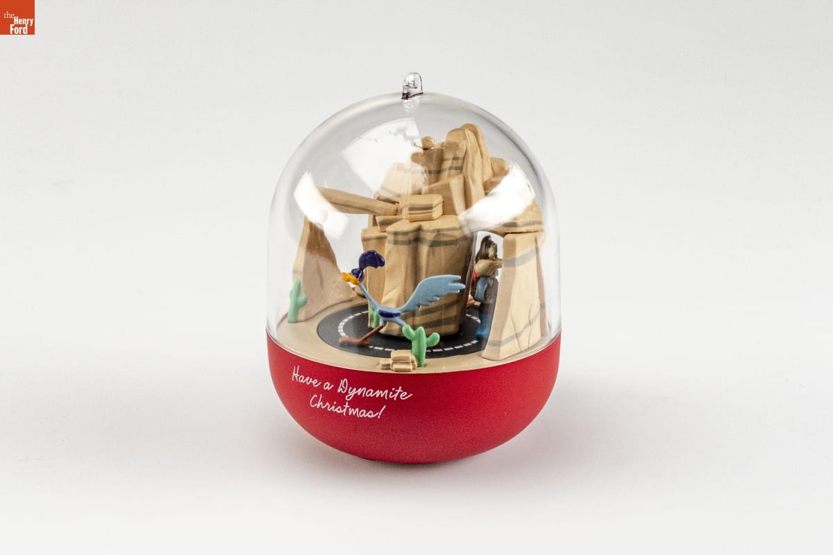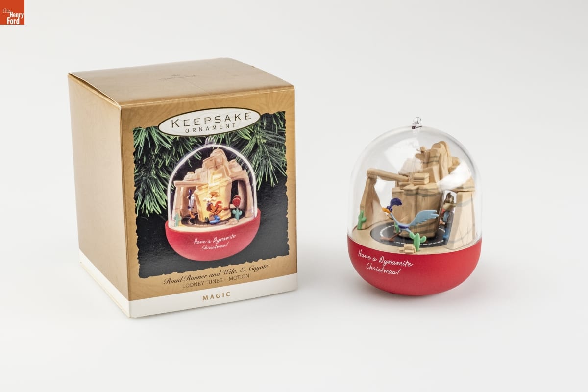 In 1990, Hallmark added on/off controls to its ornaments. In this ornament, the Road Runner dashes around the mountain with Wile E. Coyote in hot pursuit in this scene evocative of the Looney Tunes cartoon. To start the chase, one simply turns a switch on the bottom of the ornament, then turns it once again to give the characters a "rest."