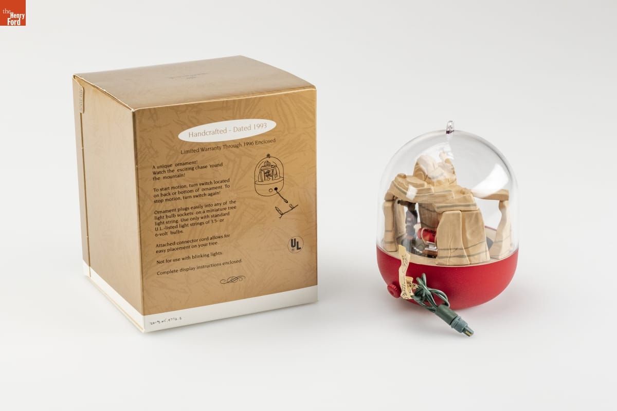 Handcrafted - Dated 1993 / Limited Warranty Through 1996 Enclosed / A unique ornament! / Watch the exciting chase 'round / the mountain! / To start motion, turn switch located / on back or bottom of ornament. To / stop motion, turn switch again! / Ornament plugs easily into any of the / light bulb sockets on a miniature tree / light string. Use only with standard / U.L.- listed / light strings of 3.5- or / 6- volt bulbs. / Attached connector cord allows for / easy placement on your tree. / Not for use with blinking lights. / Complete display instructions enclosed.