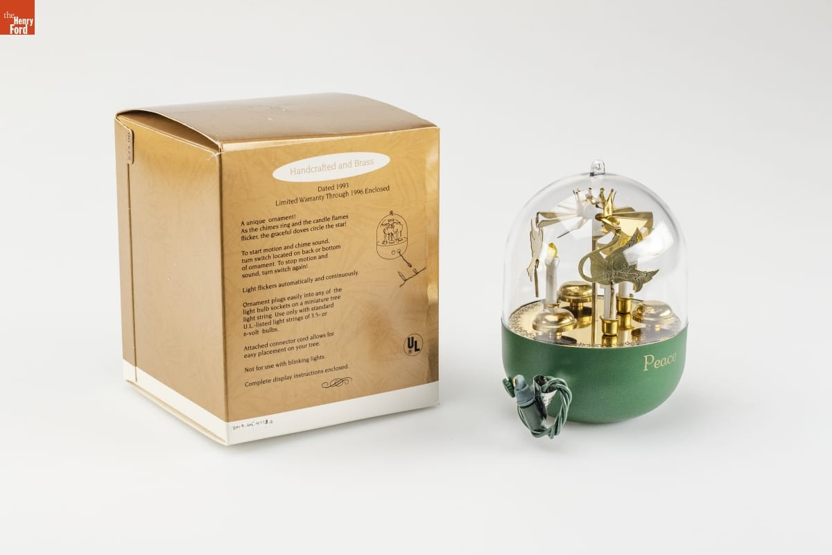 Handcrafted and Brass / Dated 1993 / Limited Warranty Through 1996 Enclosed / A unique ornament! / As the chimes ring and the candle flames / flicker, the graceful doves circle the star! / To start motion and chime sound, / turn switch located on back or bottom / of ornament. To stop motion and / sound, turn switch again! / Light flickers automatically and continuously. / Ornament plugs easily into any of the / light bulb sockets on a miniature tree / light string. Use only with standard / U.L.- listed / light strings of 3.5- or / 6- volt bulbs. / Attached connector cord allows for / easy placement on your tree. / Not for use with blinking lights. / Complete display instructions enclosed.