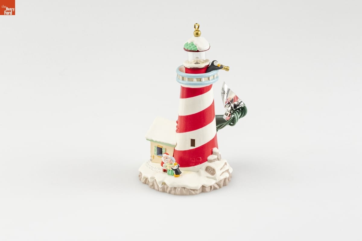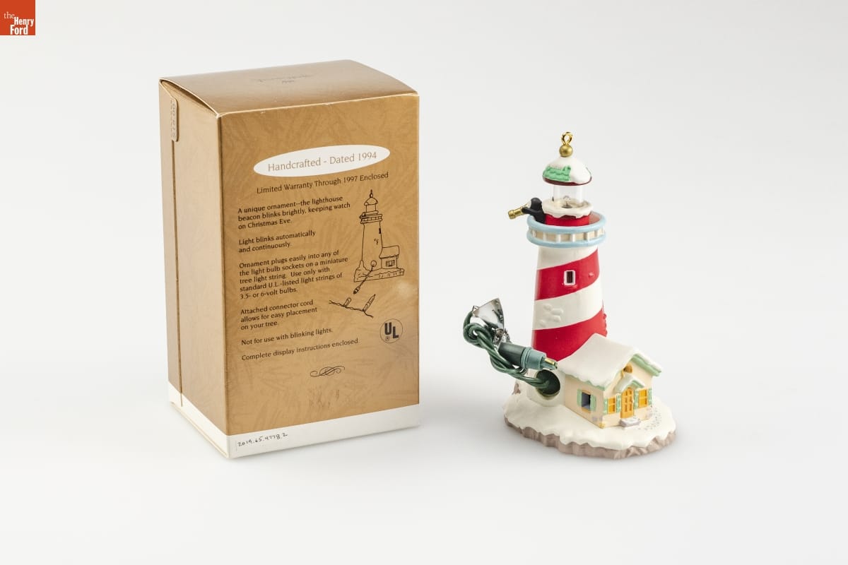Handcrafted - Dated 1994 / Limited Warranty Through 1997 Enclosed / A unique ornament -- the lighthouse / beacon blinks brightly, keeping watch / on Christmas Eve. / Light blinks automatically / and continuously. / Ornament plugs easily into any of / the light bulb sockets on a miniature / tree light string. Use only with / standard U.L.- listed / light strings of / 3.5- or 6- volt bulbs. / Attached connector cord / allows for easy placement / on your tree. / Not for use with blinking lights. / Complete display instructions enclosed.