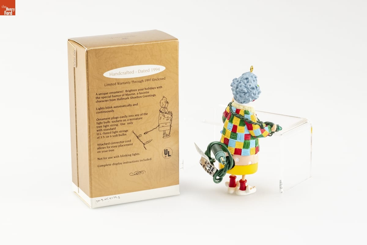 Handcrafted - Dated 1994 / Limited Warranty Through 1997 Enclosed / A unique ornament! Brighten your holidays with / the special humor of Maxine, a favorite / character from Hallmark Shoebox Greetings. / Light blinks automatically and / continuously. / Ornament plugs easily into any of the / light bulb sockets on a miniature / tree light string. Use only / with standard / U.L.- listed light strings / of 3.5- or 6- volt bulbs. / Attached connector cord / allows for easy placement / on your tree. / Not for use with blinking lights. / Complete display instructions included.