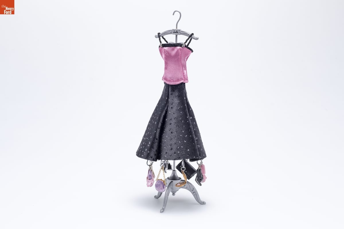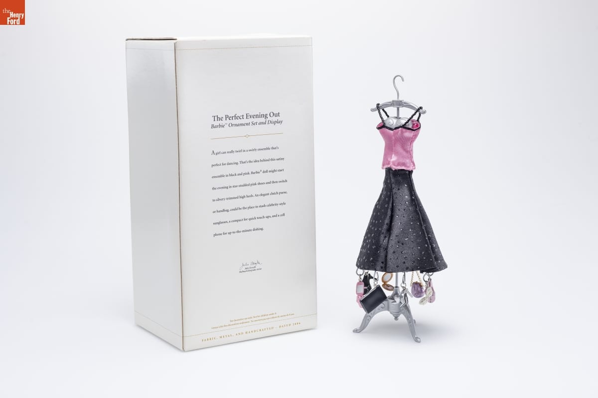 The Perfect Evening Out / Barbie TM Ornament Set and Display / A girl can really twirl in a swirly ensemble that's / perfect for dancing. That's the idea behind this satiny / ensemble in black and pink. Barbie(R) doll might start / the evening in star-studded pink shoes and then switch / to silvery-trimmed high heels. An elegant clutch purse, / or handbag, could be the place to stash celebrity-style / sunglasses, a compact for quick touch-ups, and a cell / phone for up-to-the-minute dishing. / Julie Forsyth / Hallmark Keepsake Artist / For decorative use only. Not for children under 8. / Concu a des fins decoratives seulement. Ne convient pas aux enfants de moins de 8 ans. / FABRIC, METAL, AND HANDCRAFTED - DATED 2006