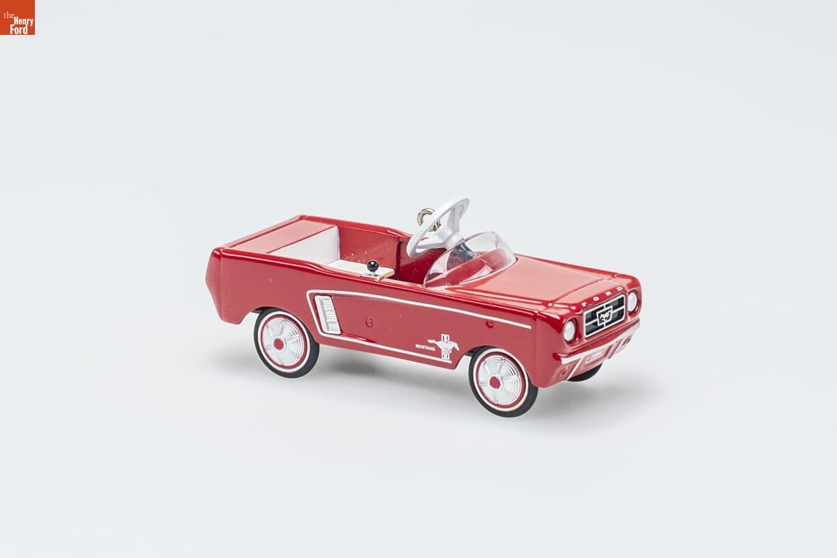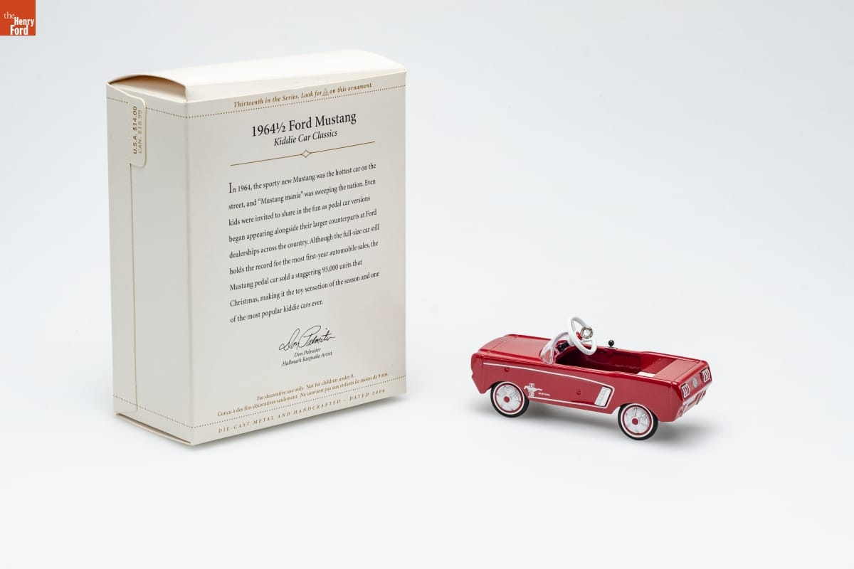 Thirteenth in the Series. Look for 13 on this ornament. / 1964 1/2 Ford Mustang / Kiddie Car Classics / In 1964, the sporty new Mustang was the hottest car on the / street, and "Mustang mania" was sweeping the nation. Even / kids were invited to share in the fun as pedal car versions / began appearing alongside their larger counterparts at Ford / dealerships across the country. Although the full-size car still / holds the record for the most first-year automobile sales, the / Mustang pedal car sold a staggering 93,000 units that Christmas, making it the toy sensation of the season and one of the most popular kiddie cars ever. / Don Palmiter / Hallmark Keepsake Artist / For decorative use only. Not for children under 8. / Concu a des fins decoratives seulement. / Ne convient pas aux enfants de moins de 8 ans. / DIE-CAST METAL AND HANDCRAFTED - DATED 2006