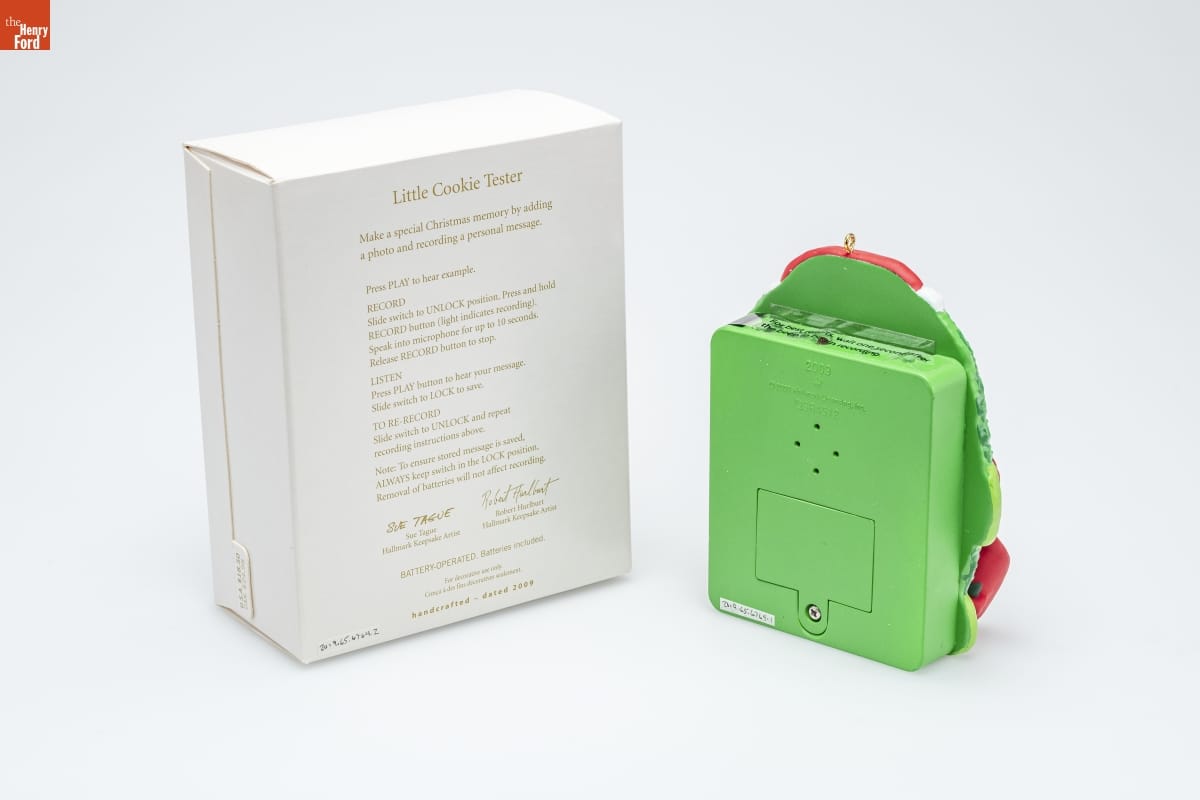 Little Cookie Tester / Make a special Christmas memory by adding / a photo and recording a personal message. / [recording instructions] / Sue Tague / Hallmark Keepsake Artist / Robert Hurlburt / Hallmark Keepsake Artist / BATTERY-OPERATED. Batteries included. / For decorative use only. / Concu a des fins decoratives seulement. / handcrafted - dated 2009