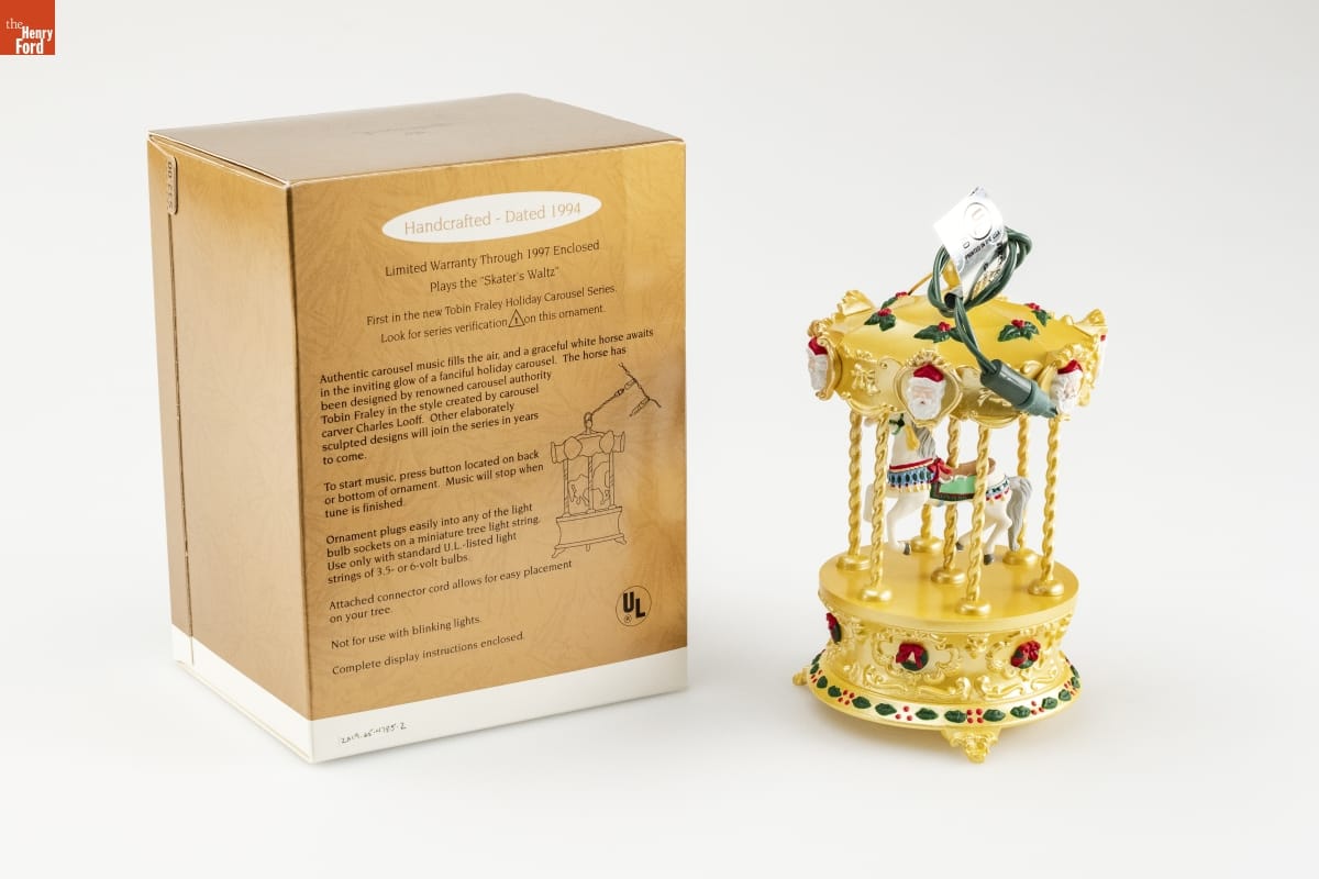 (C) Tobin Fraley 1994 / Mfd. for Hallmark Cards, Inc., K.C., Mo. 64141 / Ornament Made and Assembled in China / Music Chip Made in Taiwan / Connector Cord Made in China / Authentic Music Supplied by CARROUSEL[sic] MUSIC, Chambersburg, PA / Connector Cord U.S. Pat No. 4,544,218 / Circuitry U.S. Pat. No. 4,682,079 / QLX746-6