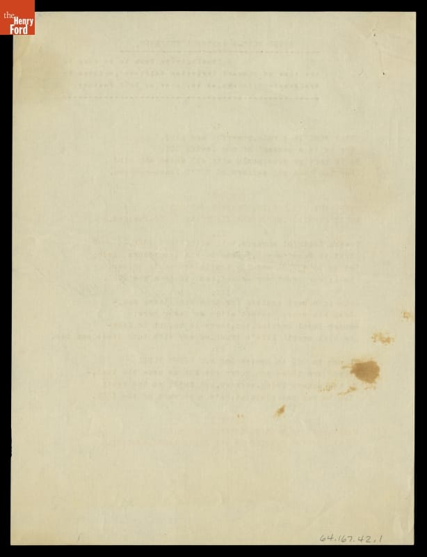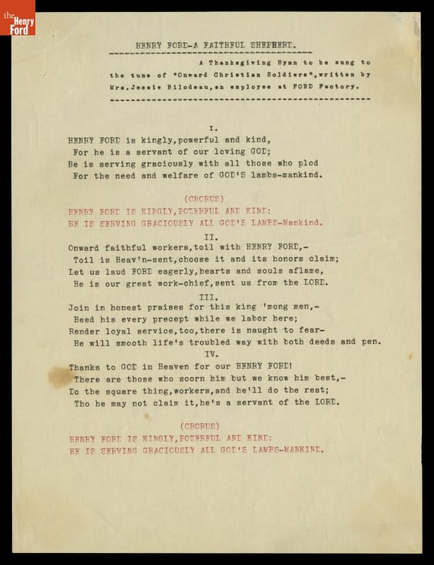 Acknowledging his innovative spirit, Henry Ford received hundreds of handmade gifts, from individuals employing their own original and imaginative efforts. This Thanksgiving hymn, with lyrics created by a Ford employee, was meant to be sung to the tune of "Onward Christian Soldiers." Although not an outwardly religious person, Henry Ford nonetheless had strong opinions on spirituality.