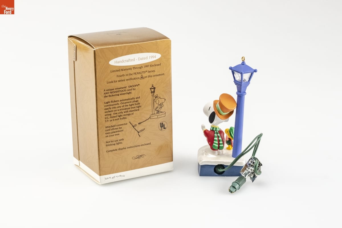 Handcrafted - Dated 1994 / Limited Warranty Through 1997 Enclosed / Fourth in the PEANUTS [R] Series. / Look for series verification 4 on this ornament. / A unique ornament! SNOOPY [R] / AND WOODSTOCK carol by / the flickering streetlight. / Light flickers automatically and / continuously. Ornament plugs / easily into any of the light bulb / sockets on a miniature tree light / string. Use only with standard / U.L.- listed light strings of / 3.5- or 6- volt bulbs. / Attached connector / cord allows for / easy placement / on your tree. / Not for use with / blinking lights. / Complete display instructions enclosed.