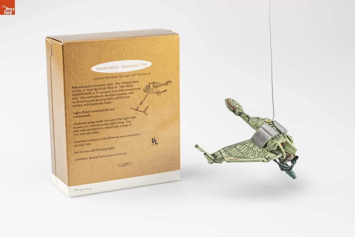 Handcrafted - Stardated 1994 / Limited Warranty Through 1997 Enclosed / Red and green Christmas alert! The "Klingon Bird / of Prey [TM]" from the STAR TREK [R]: THE NEXT / GENERATION [TM] TV program is in orbit around your / tree. This meticulously detailed starship, with / its flickering and glowing lights, will fill your / holiday with Keepsake Magic! / Light flickers automatically and / continuously. / Ornament plugs / easily into any of the light bulb / sockets on a miniature tree light string. Use / only with standard U.L.- listed light strings of / 3.5- or 6- volt bulbs. / Attached connector cord allows for easy placement / on your tree. / Not for use with blinking lights. / Complete display instructions enclosed.