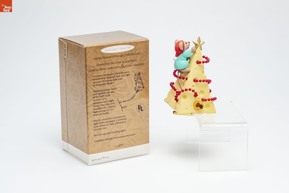 Handcrafted - Dated 1995 / Limited Warranty Through 1998 Enclosed / Eleventh in the Chris Mouse Series. / Look for series verification 11 on this ornament. / A unique ornament! -- Chris Mouse's / version of a "tasteful" tree will light / up your Christmas with a bit / of Keepsake Magic! / Ornament plugs easily / and quickly into any / of the light bulb / sockets on a / miniature tree light / string. Use only with / standard U.L.- listed / light strings of 3.5- / or 6- volt bulbs. / Handy connector cord and two / light bulbs included. Connector / cord allows for easy placement / on your tree. / Not for use with blinking lights. / Complete display instructions enclosed.