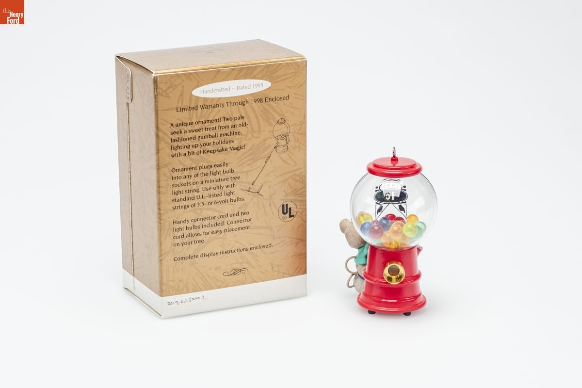 Handcrafted - Dated 1995 / Limited Warranty Through 1998 Enclosed / A unique ornament! Two pals / seek a sweet treat from an old- / fashioned gumball machine, / lighting up your holidays / with a bit of Keepsake Magic! / Ornament plugs easily / into any of the light bulb / sockets on a miniature tree / light string. Use only with / standard U.L.- listed light / strings of 3.5- or 6- volt bulbs. / Handy connector cord and two / light bulbs included. Connector / cord allows for easy placement / on your tree. / Complete display instructions enclosed.