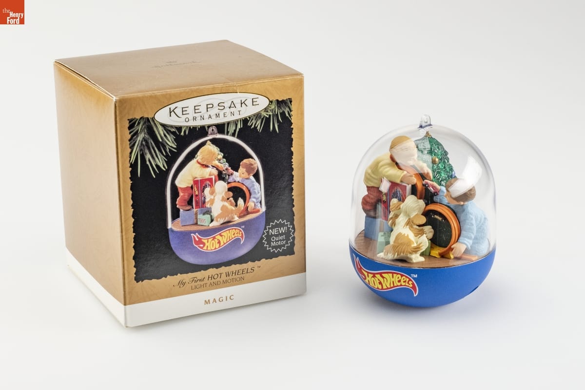 Toys that delighted us as kids have found their way into Hallmark ornaments. Hallmark even created some of these ornaments with light, motion, and sound. In "My First HOT WHEELS," Santa shares in the excitement of a boy and his pet, as Hot Wheels cars loop again and again around the track at the flip of a switch.