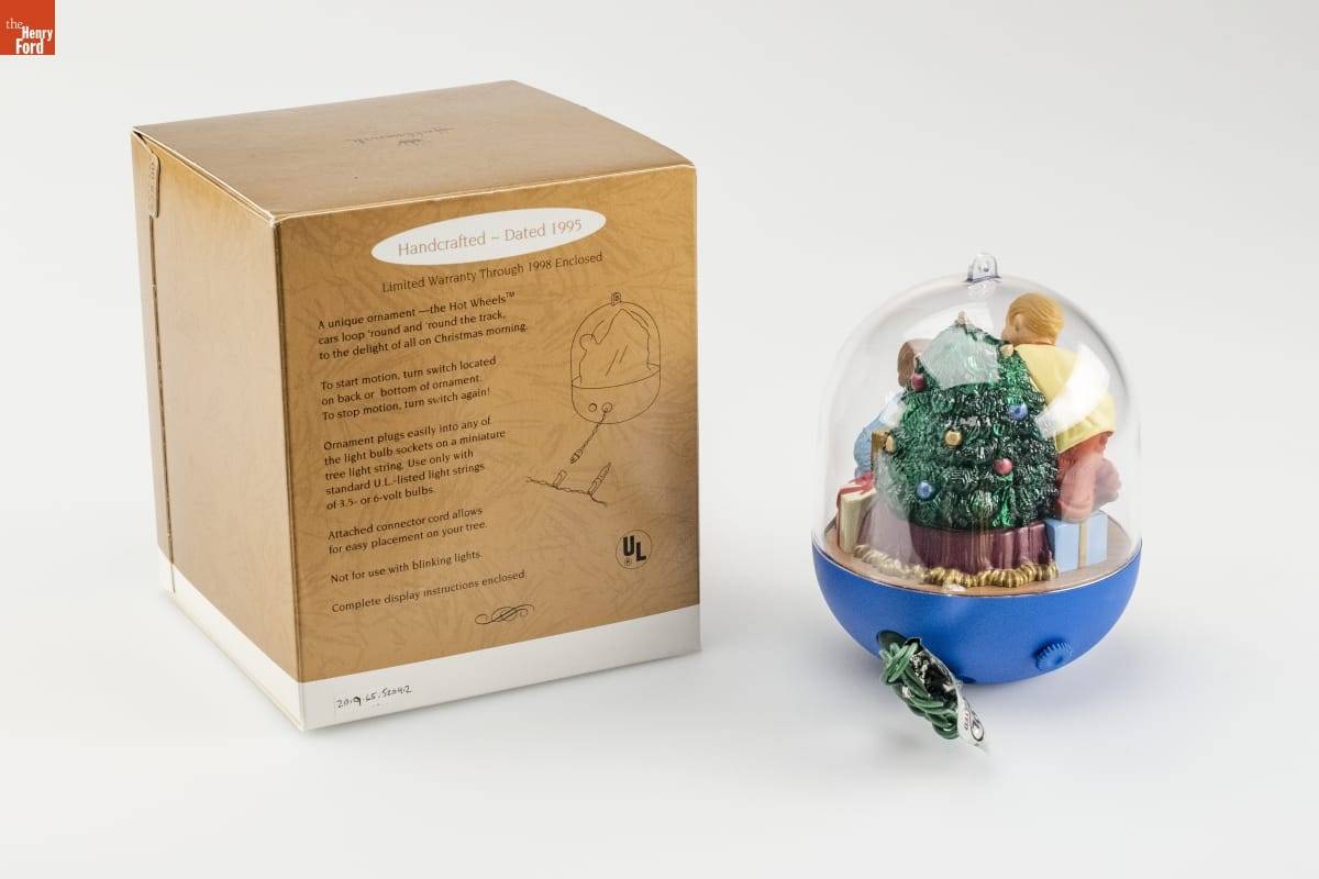 Handcrafted - Dated 1995 / Limited Warranty Through 1998 Enclosed / A unique ornament -- the Hot Wheels [TM] / cars loop 'round and 'round the track, / to the delight of all on Christmas morning. / To start motion, turn switch located / on back or bottom of ornament. / To stop motion, turn switch again! / Ornament plugs easily into any of / the light bulb sockets on a miniature / tree light string. Use only with / standard U.L.- listed light strings of / 3.5- or 6- volt bulbs. / Attached connector cord allows / for easy placement on your tree. / Not for use with blinking lights. / Complete display instructions enclosed.