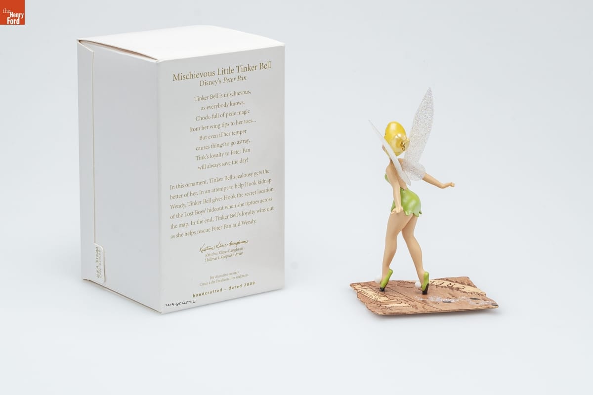 Mischievous Little Tinker Bell / Disney's Peter Pan / Tinker Bell is mischievous, / as everybody knows, / Chock-full of pixie magic / from her wing tips to her toes... / But even if her temper / causes things to go astray, / Tink's loyalty to Peter Pan / will always save the day! / In this ornament, Tinker Bell's jealousy get the / better of her. In an attempt to help Hook kidnap / Wendy, Tinker Bell gives Hook the secret location / of the Lost Boy's hideout when she tiptoes across / the map. In the end, Tinker Bell's loyalty wins out / as she helps rescue Peter Pan and Wendy. / Katrina Kline-Gaughran / Hallmark Keepsake Artist / For decorative use only. / Concu a des fins decoratives seulement. / handcrafted - dated 2009