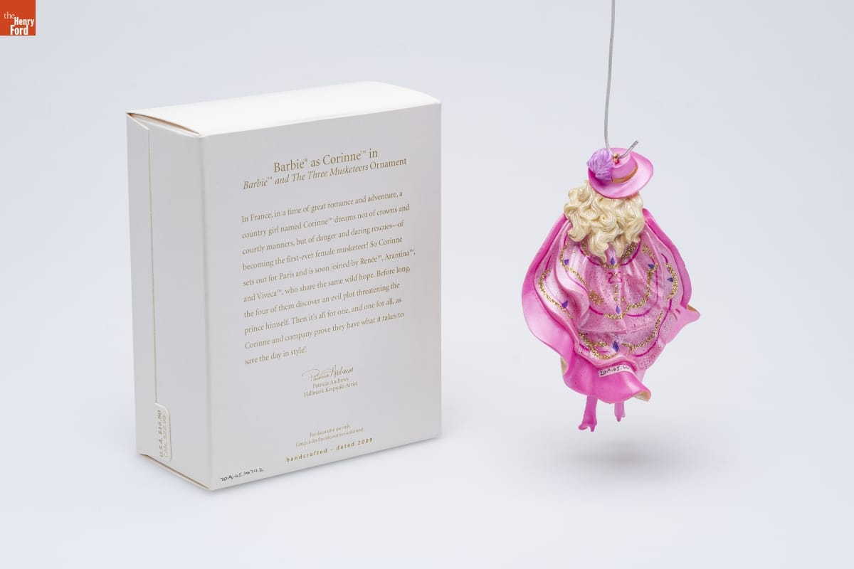 Barbie [R] as Corinne [TM] in / Barbie [TM] and The Three Musketeers Ornament / In France, in a time of great romance and adventure, a / country girl named Corinne [TM] dreams not of crowns and / courtly manners, but of danger and daring rescues--of / becoming the first-ever female musketeer! So Corinne / sets out for Paris and is soon joined by Renee [TM], Aramina [TM], / and Viveca [TM], who share the same wild hope. Before long, / the four of them discover an evil plot threatening the / prince himself. Then it's all for one, and one for all, as / Corinne and company prove they have what it takes to / save the day in style! / Patricia Andrews / Hallmark Keepsake Artist / For decorative use only. / Concu a des fins decoratives seulement. / handcrafted - dated 2009