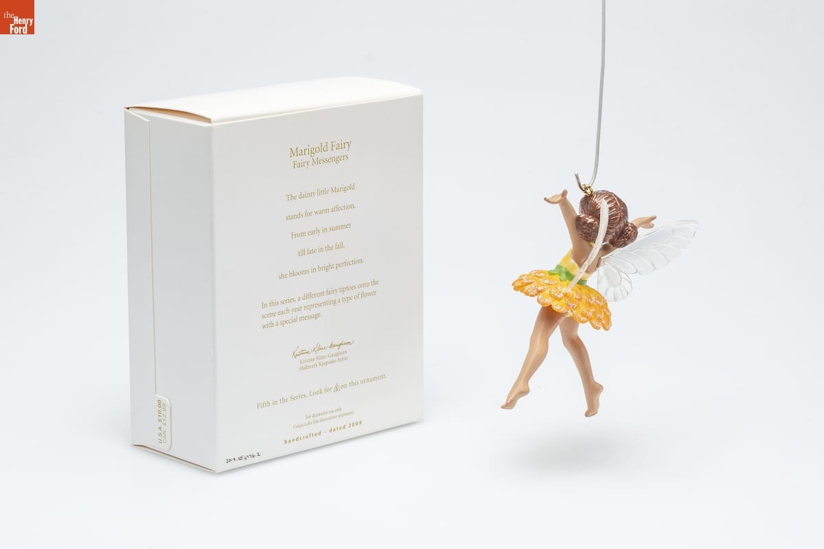 Marigold Fairy / Fairy Messengers / The dainty little Marigold / stands for warm affection. / From early in summer / till late in the fall, / she blooms in bright perfection. / In this series, a different fairy tiptoes onto the / scene each year representing a type of flower / with a special message. / Kristina Kline-Gaughran / Hallmark Keepsake Artist / Fifth in the Series. Look for 5 on this ornament. / For decorative use only. / Concu a des fins decoratives seulement. / handcrafted - dated 2009