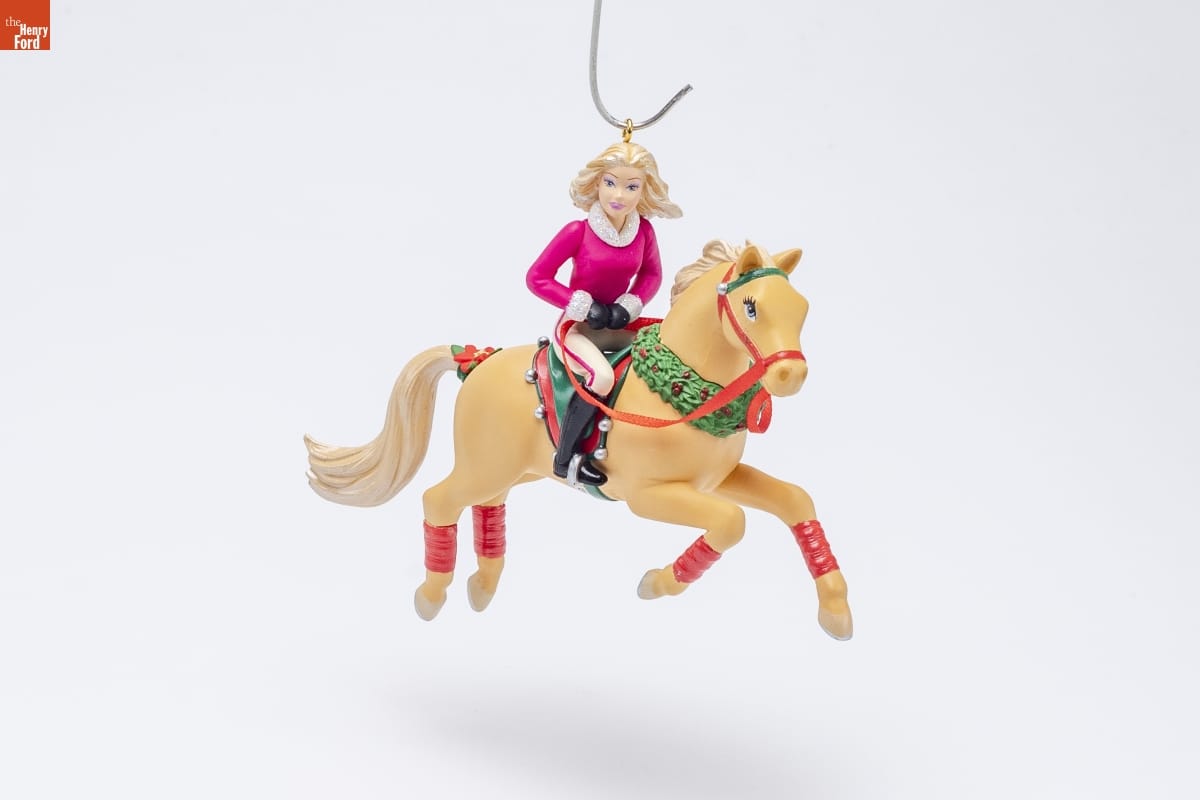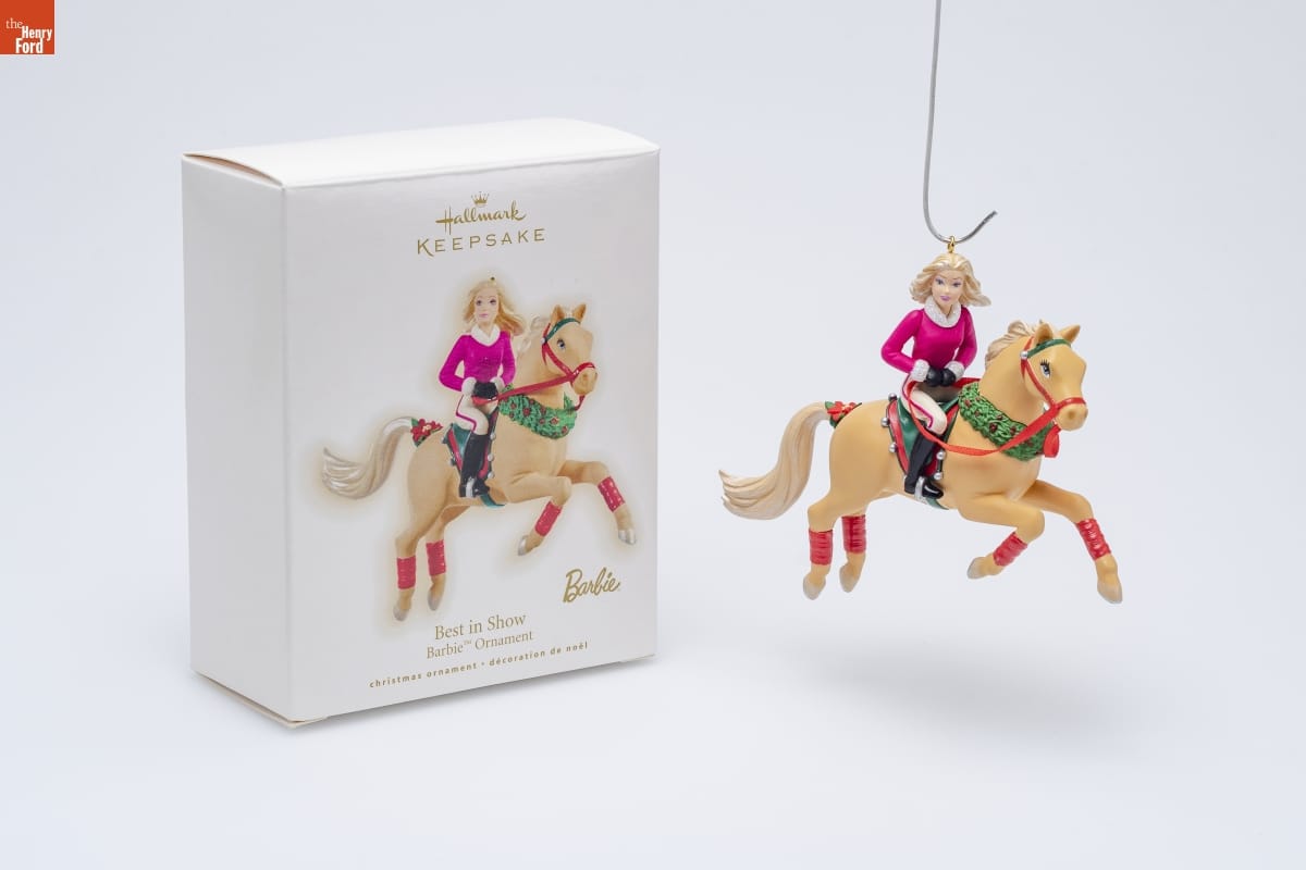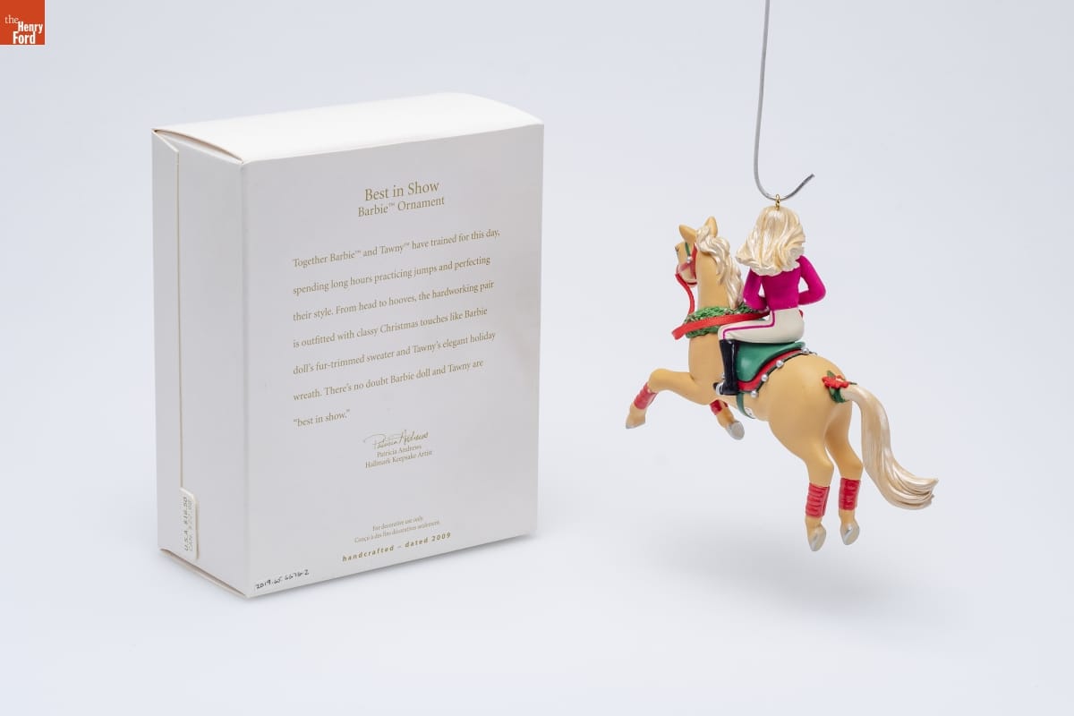 Best in Show / Barbie [TM] Ornament / Together Barbie [TM] and Tawny [TM] have trained for this day, / spending long hours practicing jumps and perfecting / their style. From head to hooves, the hardworking pair / is outfitted with classy Christmas touches like Barbie / doll's fur-trimmed sweater and Tawny's elegant holiday / wreath. There's no doubt Barbie doll and Tawny are / "best in show." / Patricia Andrews / Hallmark Keepsake Artist / For decorative use only. / Concu a des fins decoratives seulement. / handcrafted - dated 2009