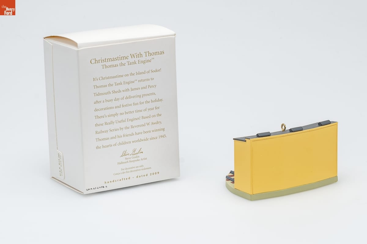 Christmastime With Thomas / Thomas the Tank Engine [TM] / It's Christmastime on the Island of Sodor! / Thomas the Tank Engine [TM] returns to / Tidmouth Sheds with James and Percy / after a busy day of delivering presents, / decorations and festive fun for the holiday. / There's simply no better time of the year for / these Really Useful Engines! Based on the / Railway Series by the Reverend W. Awdry, / Thomas and his friends have been winning / the hearts of children worldwide since 1945. / Steve Goslin / Hallmark Keepsake Artist / For decorative use only. / Concu a des fins decoratives seulement. / handcrafted - dated 2009