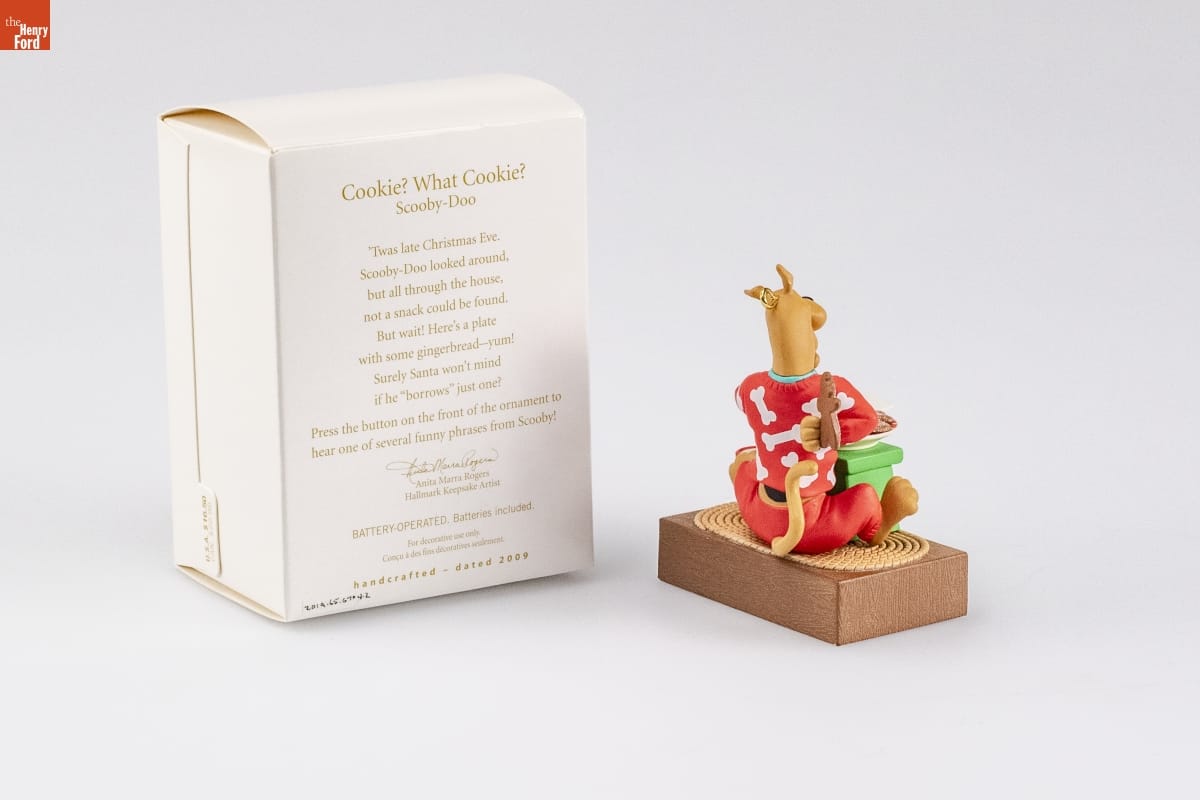 Cookie? What Cookie? / Scooby-Doo / 'Twas late Christmas Eve. / Scooby-Doo looked around, / but all through the house, / not a snack could be found. / But wait! Here's a plate / with some gingerbread--yum! / Surely Santa won't mind / if he "borrows" just one? / Press the button on the front of the ornament to / hear one of several funny phrases from Scooby! / Anita Marra Rogers / Hallmark Keepsake Artist / BATTERY-OPERATED. Batteries included. / For decorative use only. / Concu a des fins decoratives seulement. / handcrafted - dated 2009