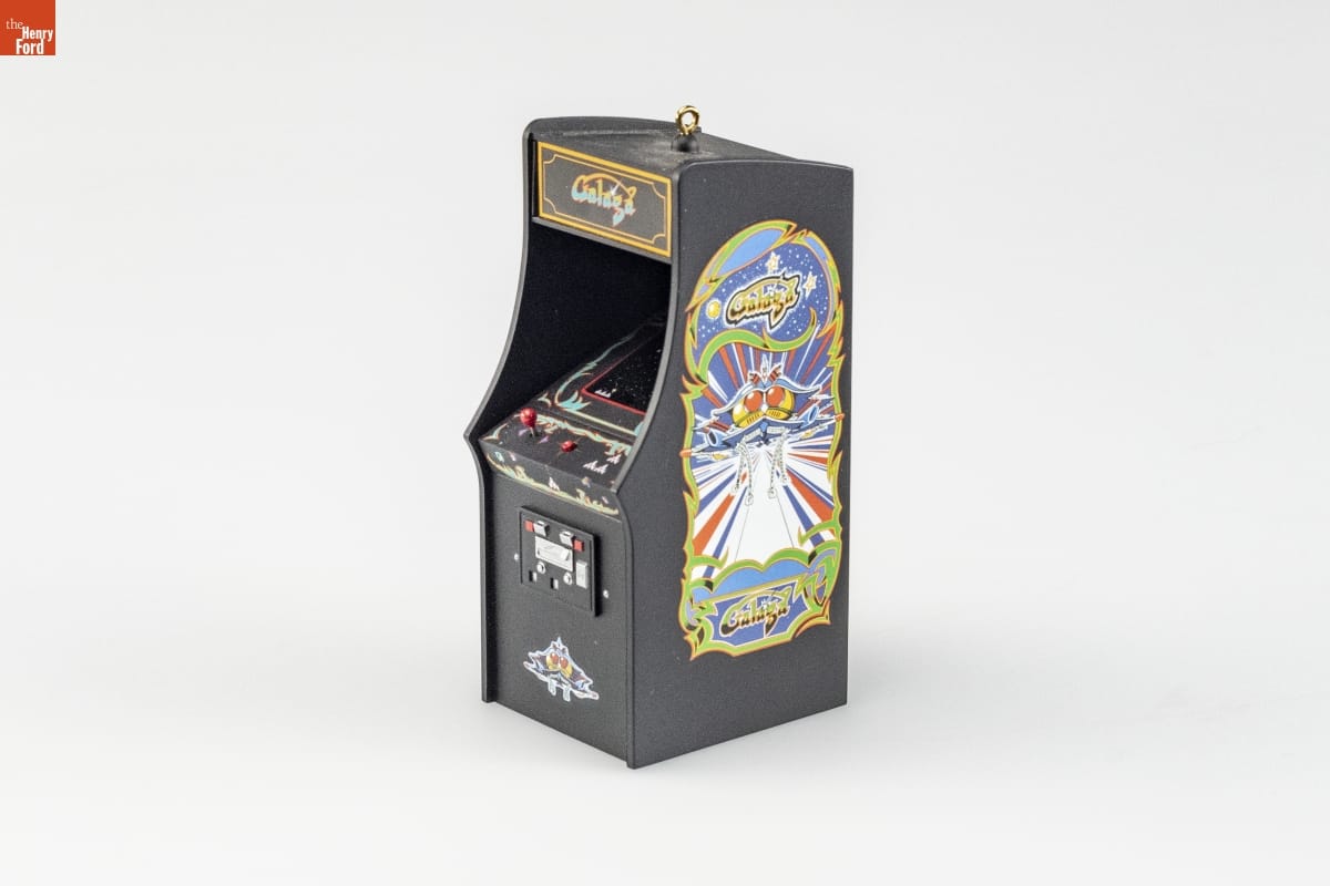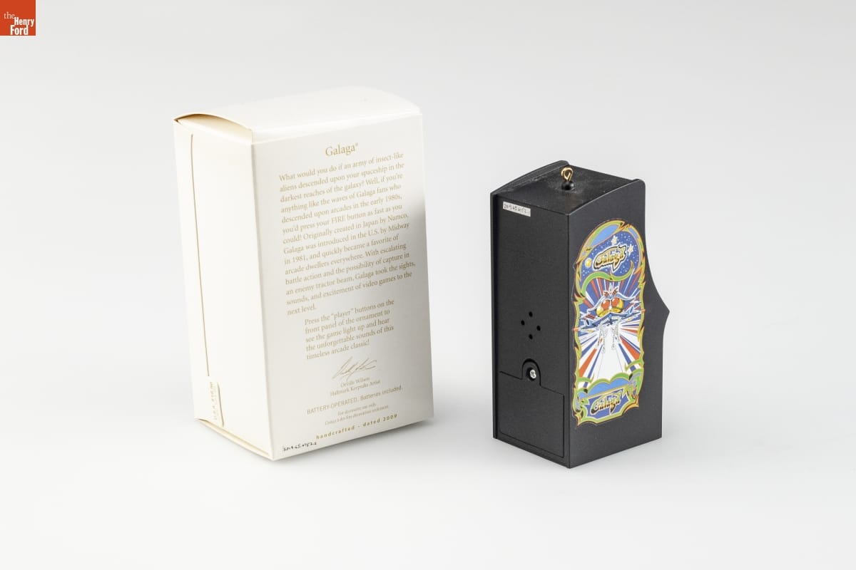 With its light and sound effects, Hallmark's "Galaga" captured the sights, sounds, and excitement of the popular 1980s arcade game. Nearly 30 years after Galaga's debut, this small ornament version delighted video arcade fans with a reminder of hours spent battling aliens in the darkest corners of the galaxy. It was designed by Orville Wilson--a Hallmark artist who loves playing video games.