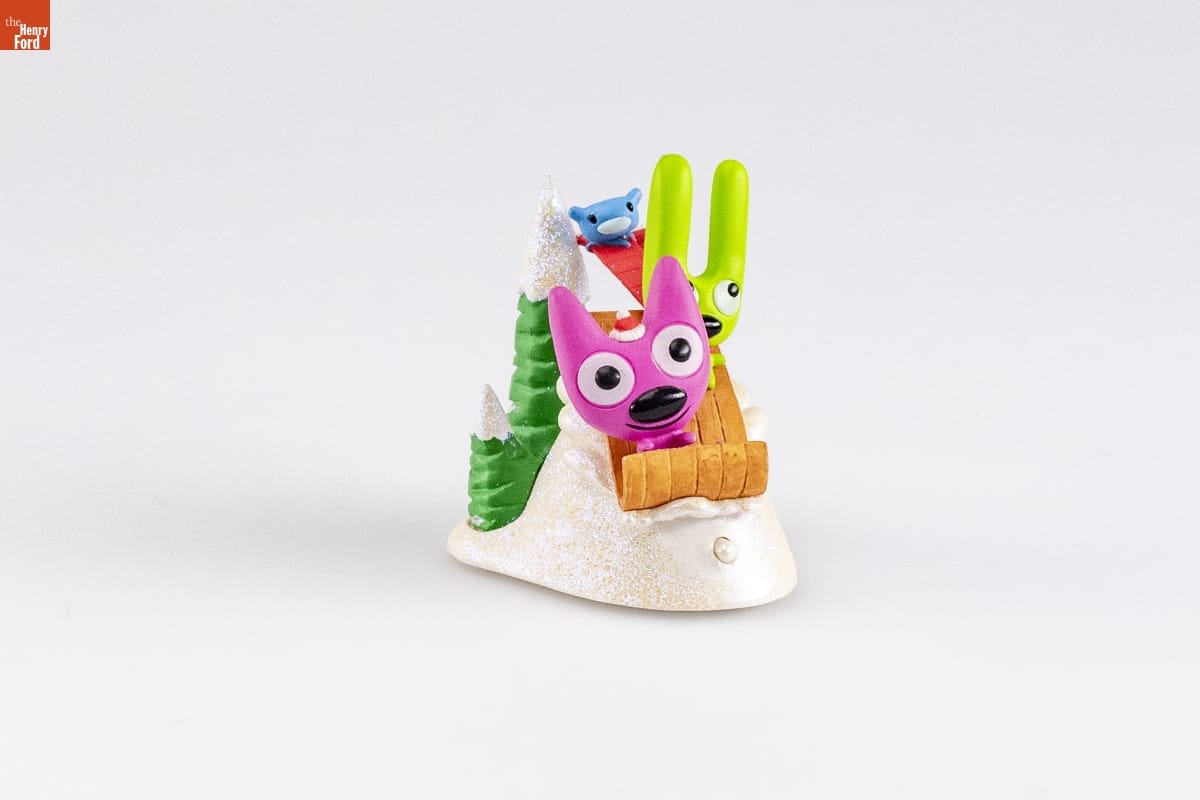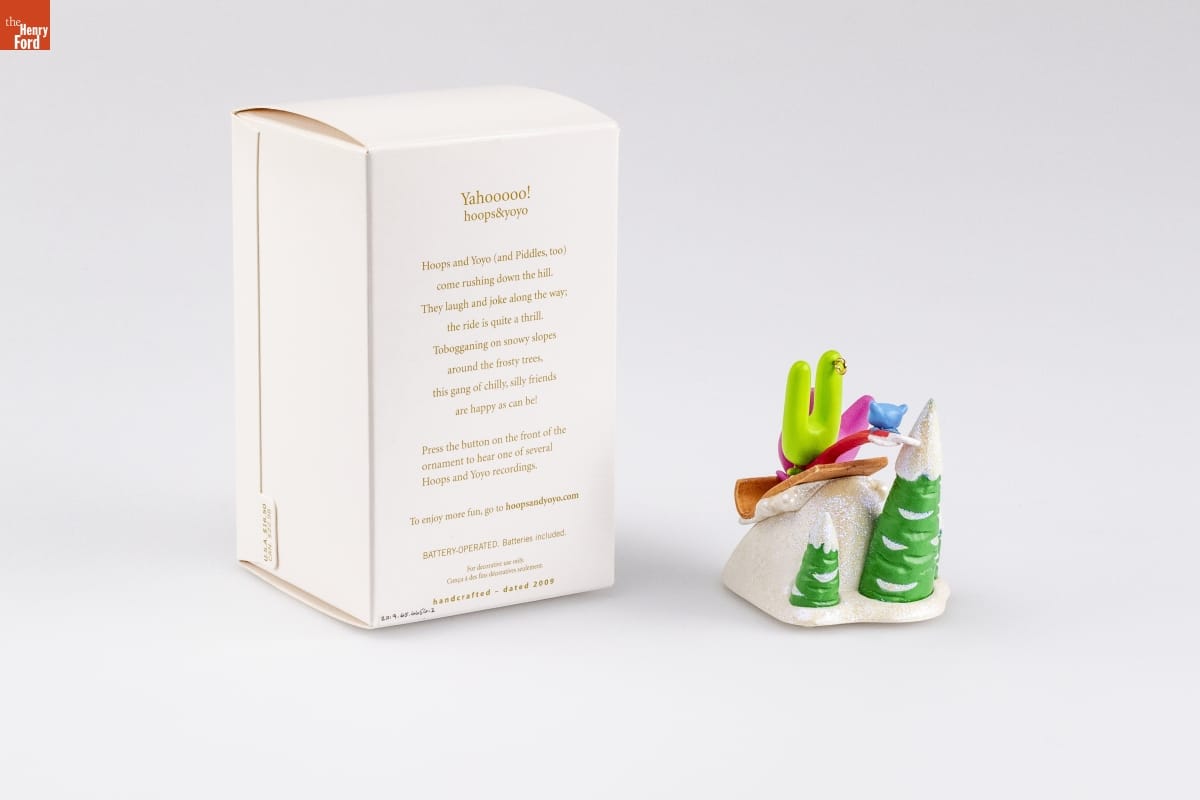 Yahooooo! / hoops&yoyo / Hoops and Yoyo (and Piddles, too) / come rushing down the hill. / They laugh and joke along the way; / the ride is quite a thrill. / Tobogganing on snowy slopes / around the frosty trees, / this gang of chilly, silly friends / are happy as can be! / Press the button on the front of the / ornament to hear one of several / Hoops and Yoyo recordings. / To enjoy more fun, go to hoopsandyoyo.com / BATTERY-OPERATED. Batteries included. / For decorative use only. / Concu a des fins decoratives seulement. / handcrafted - dated 2009
