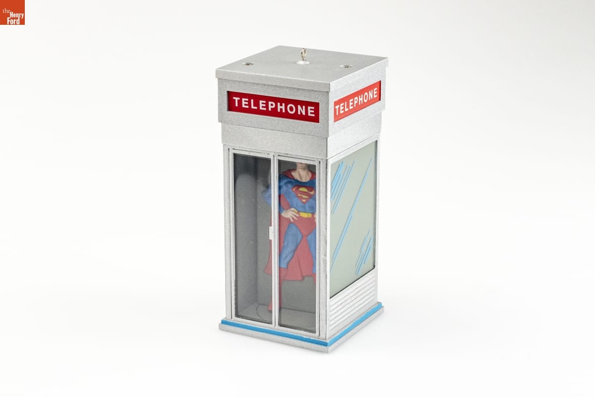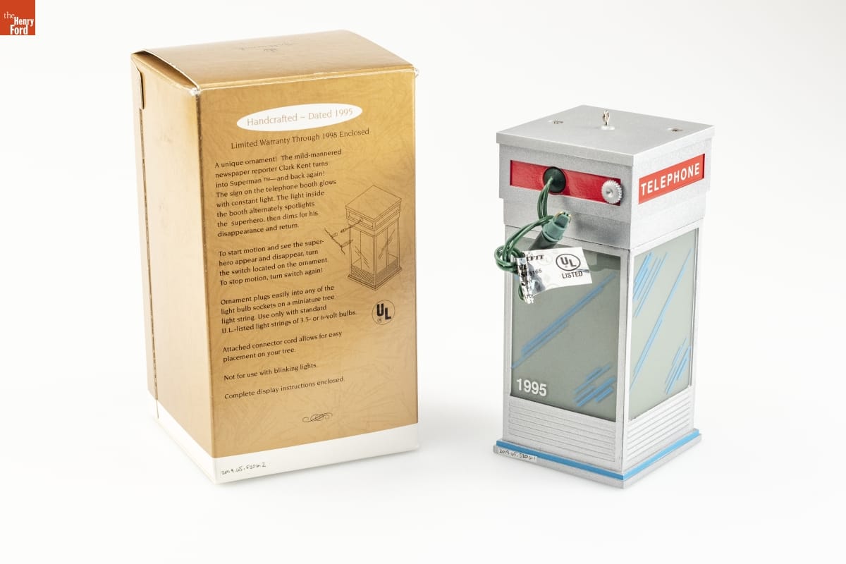 Handcrafted - Dated 1995 / Limited Warranty Through 1998 Enclosed / A unique ornament! The mild-mannered / newspaper reporter Clark Kent turns / into Superman [TM] -- and back again! / The sign on the telephone booth glows / with constant light. The light inside / the booth alternately spotlights / the superhero, then dims for his / disappearance and return. / To start motion and see the super- / hero appear and disappear, turn / the switch located on back of the ornament. / To stop motion, turn switch again! / Ornament plugs easily into any of the / light bulb sockets on a miniature tree / light string. Use only with standard / U.L.- listed light strings of 3.5- or / 6- volt bulbs. / Attached connector cord allows for easy / placement on your tree. / Not for use with blinking lights. / Complete display instructions enclosed.