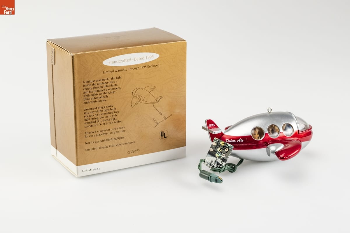 Handcrafted - Dated 1995 / Limited Warranty Through 1998 Enclosed / A unique ornament-- the light / inside the airplane casts a / cheery glow on pilot Santa / and his reindeer passengers, / while lights on the wings / blink automatically / and continuously. / Ornament plugs easily / into any of the light bulb / sockets on a miniature tree / light string. Use only with / standard U.L.- listed light / strings of 3.5- or 6- volt bulbs. / Attached connector cord allows / for easy placement on your tree. / Not for use with blinking lights. / Complete display instructions enclosed.